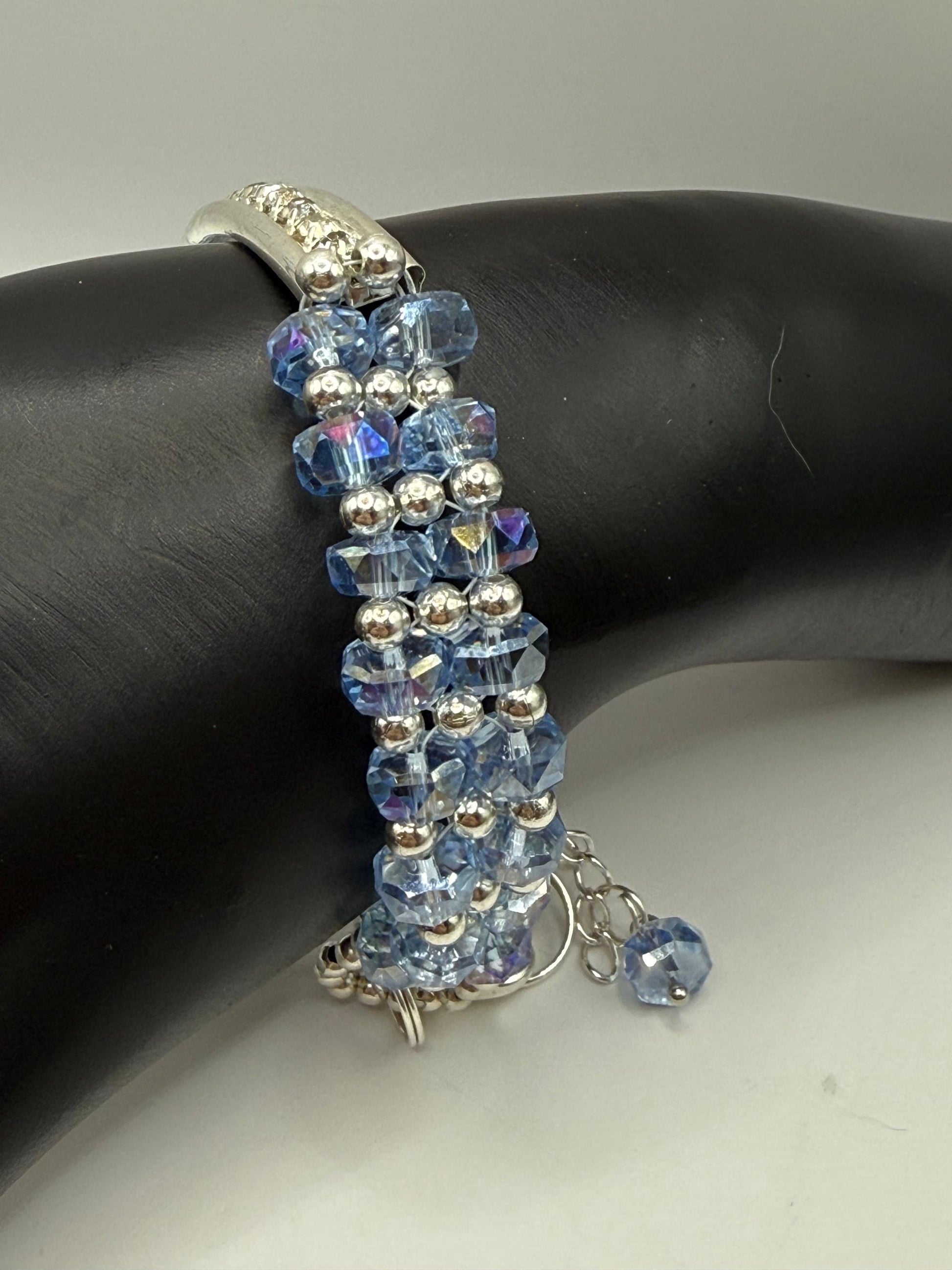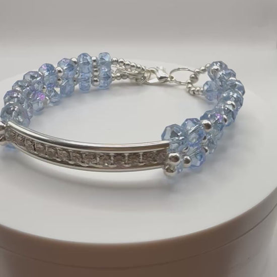 Add a touch of sparkle to your wrist with this stunning 7.5” handmade bracelet. Featuring shimmering sky-blue crystal beads, a radiant rhinestone-studded silver bar focal, and a secure lobster clasp with adjustable extender, this piece is perfect for everyday elegance or special occasions. Lightweight, comfortable, and versatile – it’s a beautiful gift for birthdays, anniversaries, or simply treating yourself.Details:- Length: 7.5” (with extender for adjustable fit)