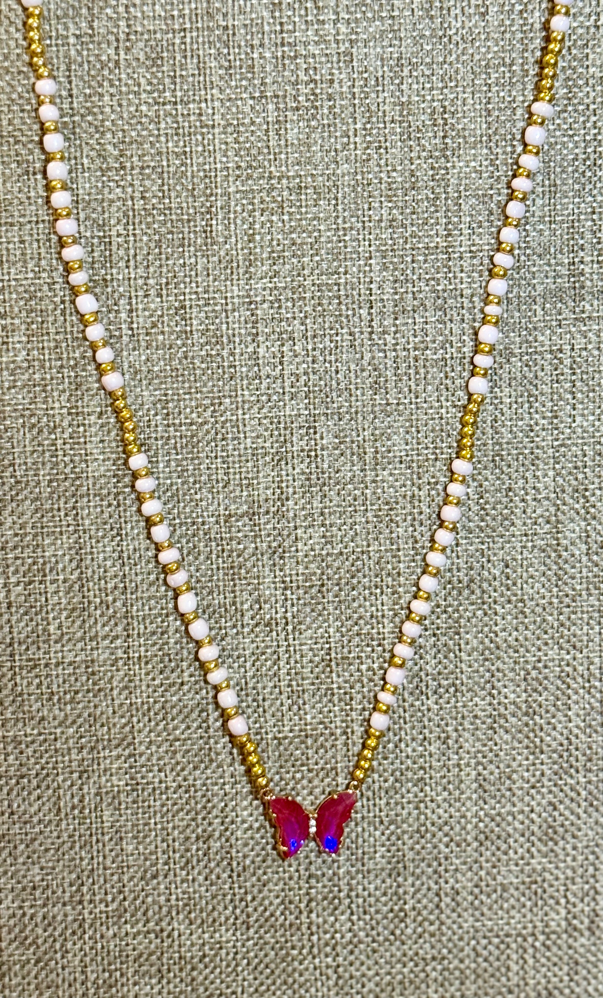 gold and pink beaded necklace, pink butterfly pendant, handmade jewelry Texas, dainty feminine necklace, bright pink necklace, butterfly jewelry gift, gold beaded necklace, bougie on a budget, lucky charm boutique