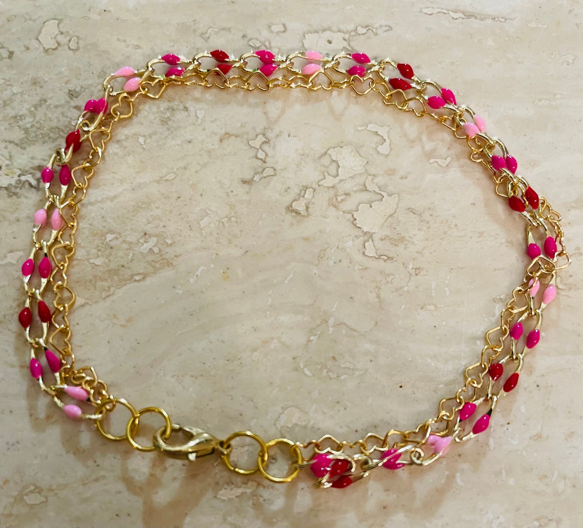 This Golden Sweetheart 8” double strand bracelet and matching earrings set is truly breathtaking. Combining beautiful pink and red tones with delicate gold heart strands, this set is perfect for any special occasion. The earrings add a touch of elegance and complete this stunning set.