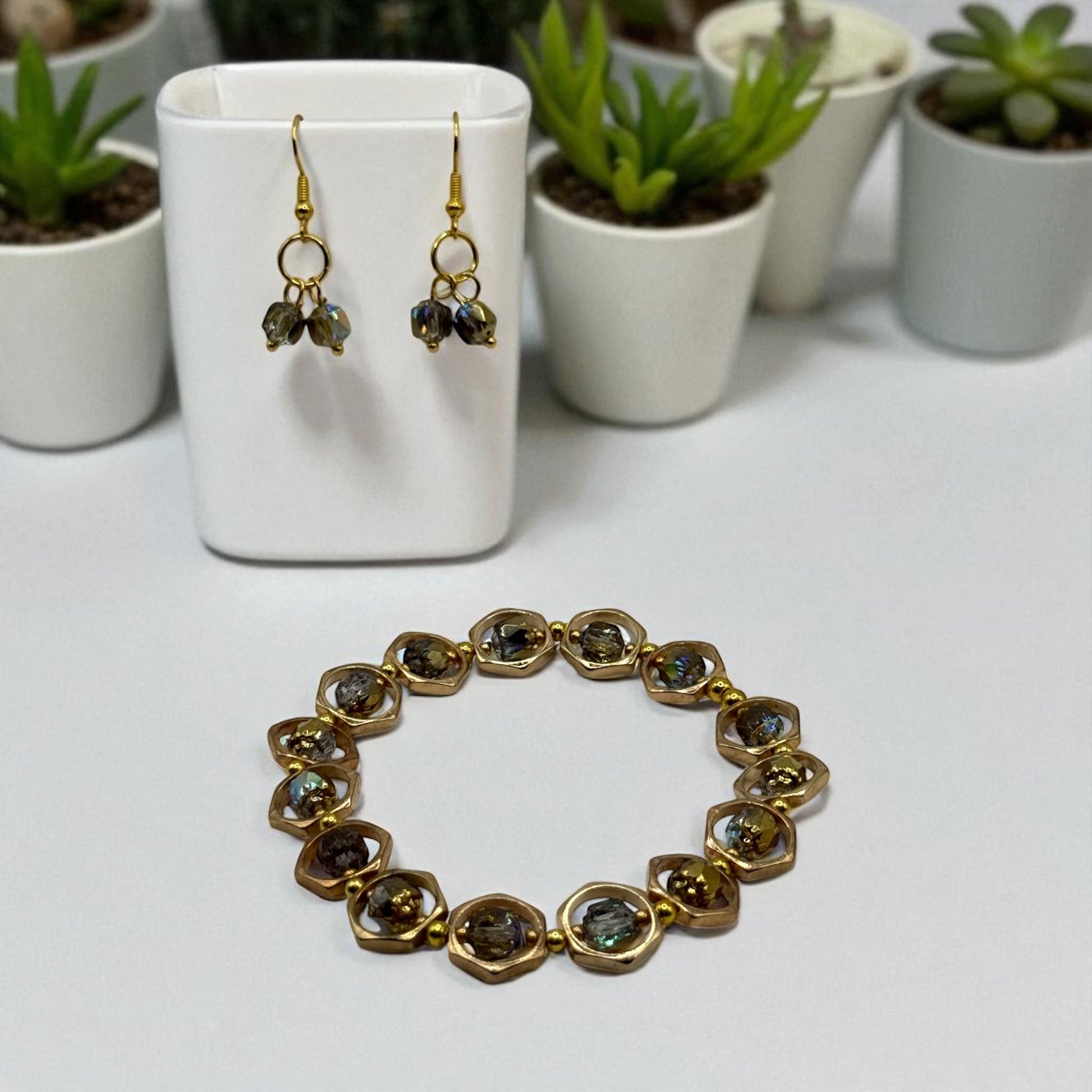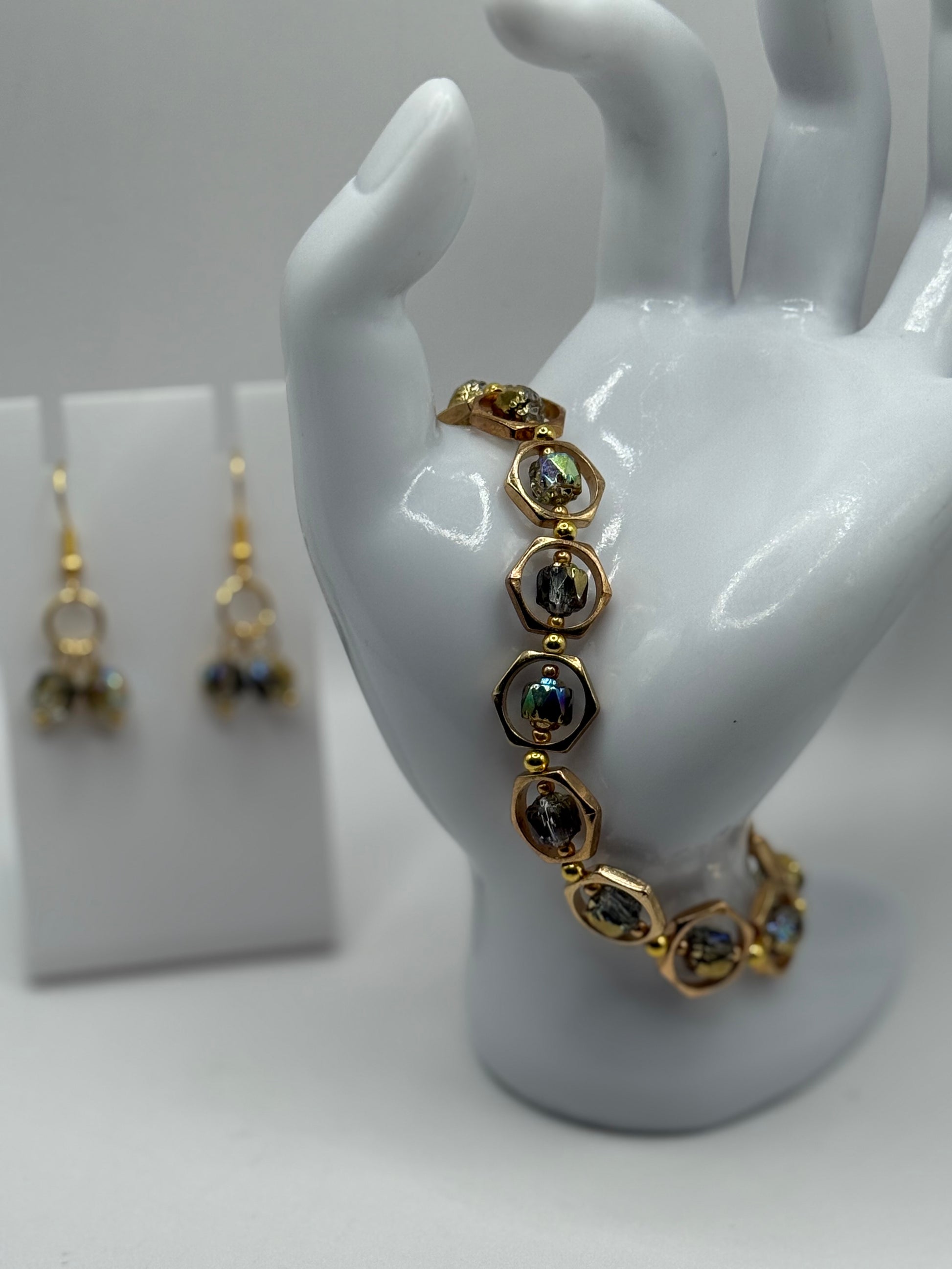 gold lantern bracelet, rainbow glass bead bracelet, 7.75 bracelet, gold tone stretch bracelet, iridescent jewelry, boho chic bracelet, handmade bracelet Texas, hexagon bracelet, LuckyCharm Boutique TX, gift for her