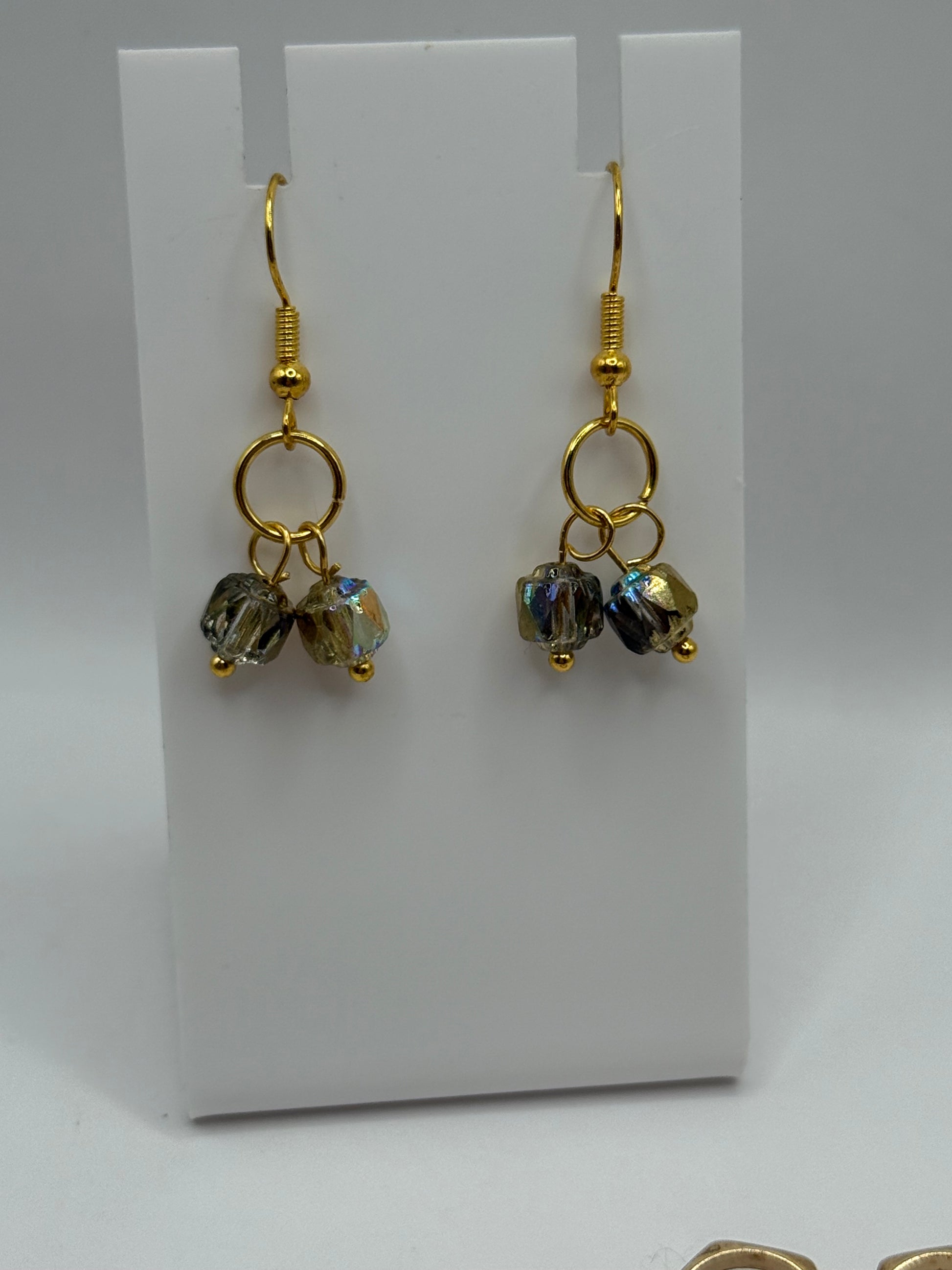 - Gold-tone hexagonal frames with rainbow-finish glass lantern beads