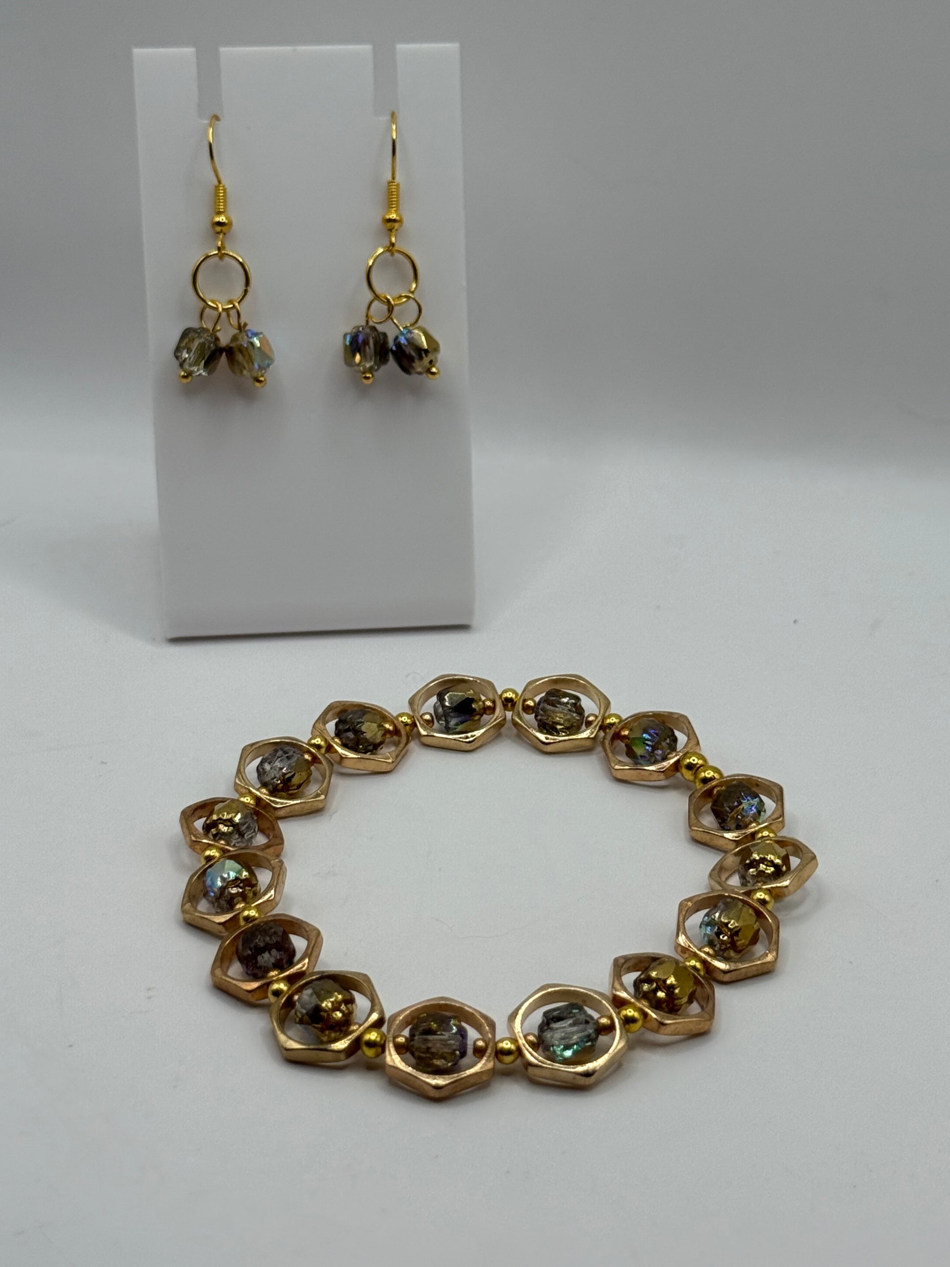 Add a touch of luminous sophistication with this 7.75” golden-tone stretch bracelet featuring iridescent rainbow lantern beads framed in sleek hexagonal settings. Each bead glimmers with shifting tones of gold, bronze, and aqua—catching the light from every angle.