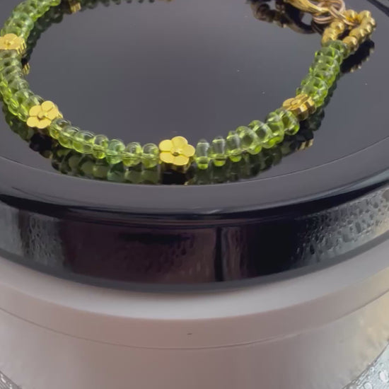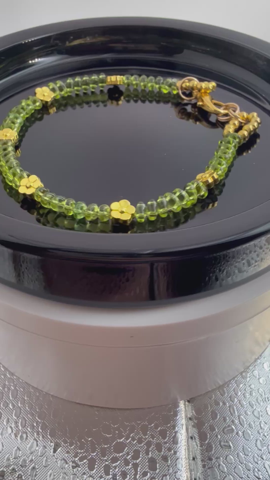 Elevate your style with our Green and Gold Glass Bracelet. Expertly crafted with delicate glass beads, this bracelet boasts a stunning green hue adorned with intricate gold flower accents. With a perfect 8" fit, it can also be resized for free upon request, making it the ideal accessory for any wrist size.