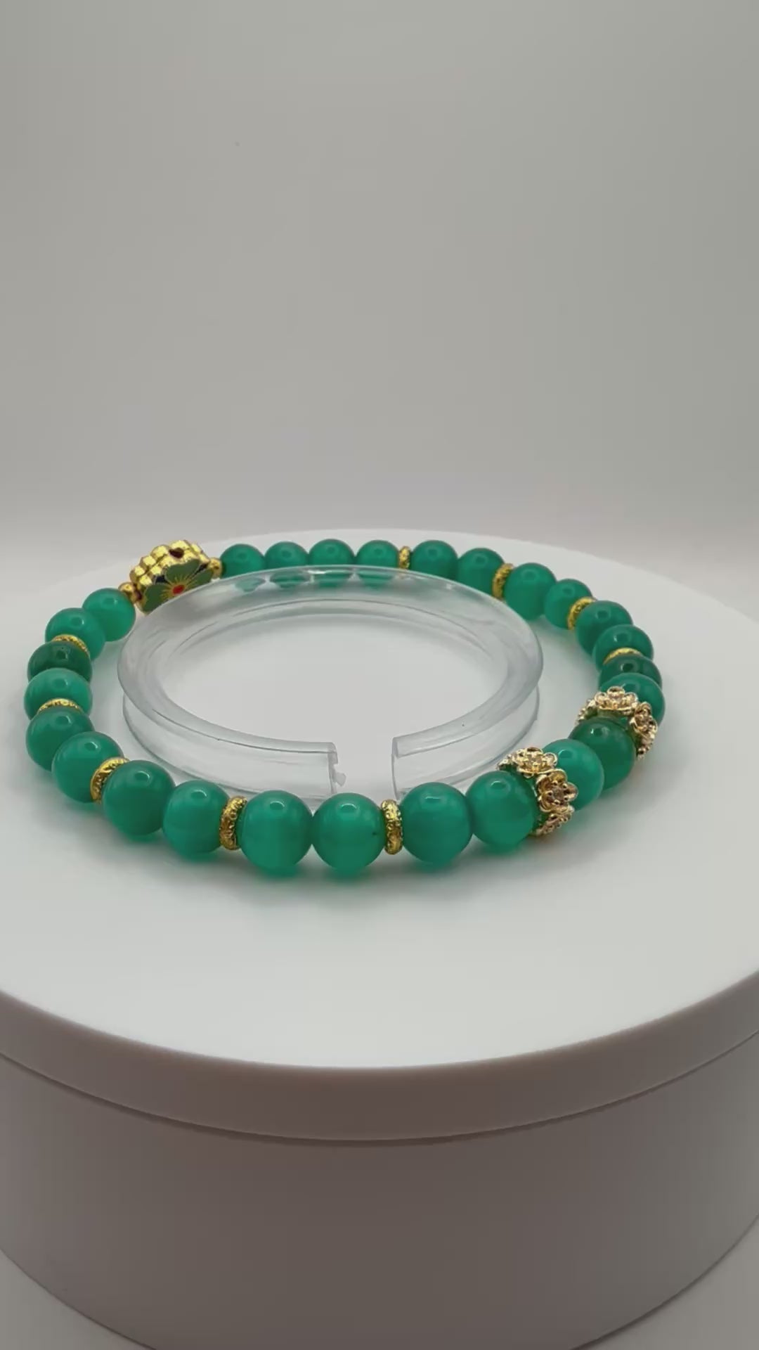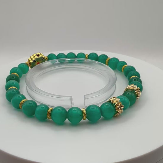 Green Cat Eye Effect Glass with Clover Focal Stretch Bracelet 7.5"