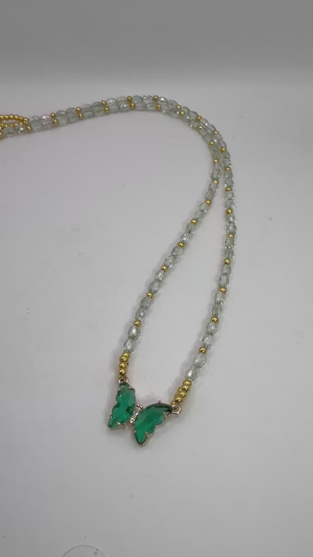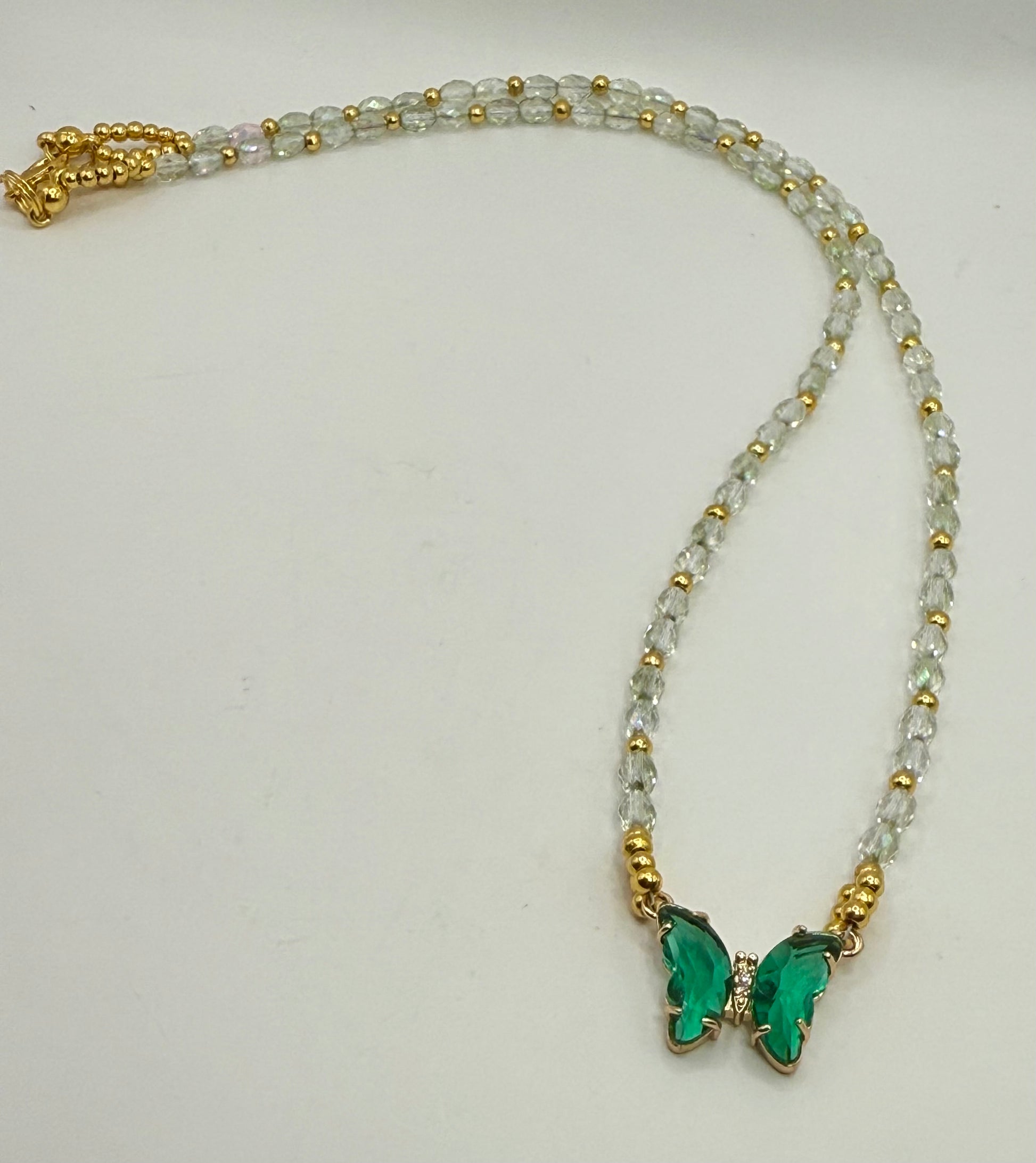 Make a bold yet elegant statement with this handmade 20” necklace featuring a dazzling green butterfly pendant. The pendant shimmers with crystal-like sparkle, beautifully complemented by faceted glass beads and gold-tone accents for a chic and timeless look.