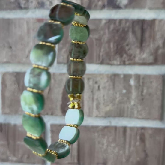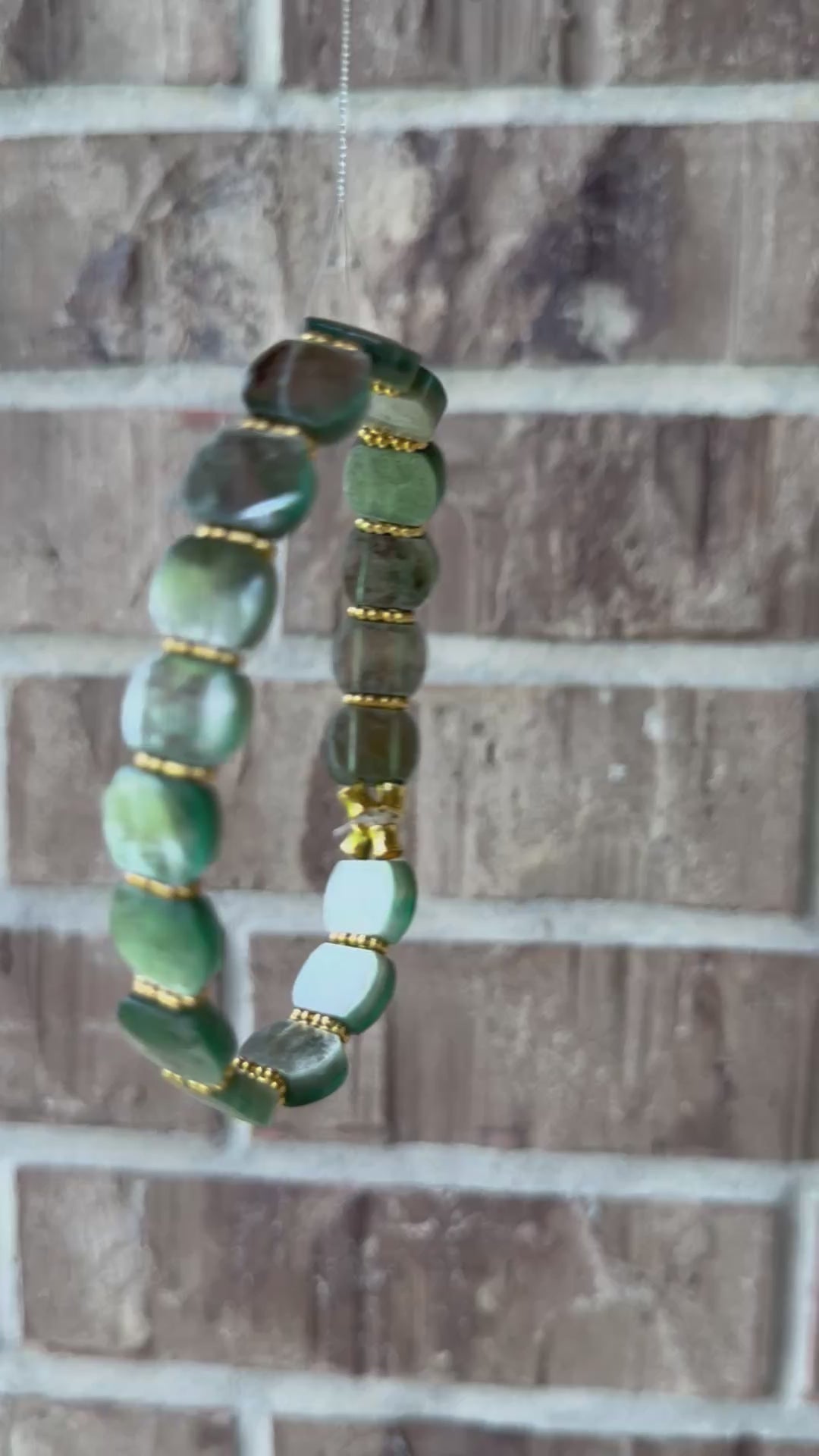 This stunning stretch bangle is made of mesmerizing green mica with gold accents. It's the perfect addition to any collection, with an ideal size for a 7.75" wrist. And don't worry about fit - our bracelets at Luckycharm Boutique can be resized at no extra cost upon request.