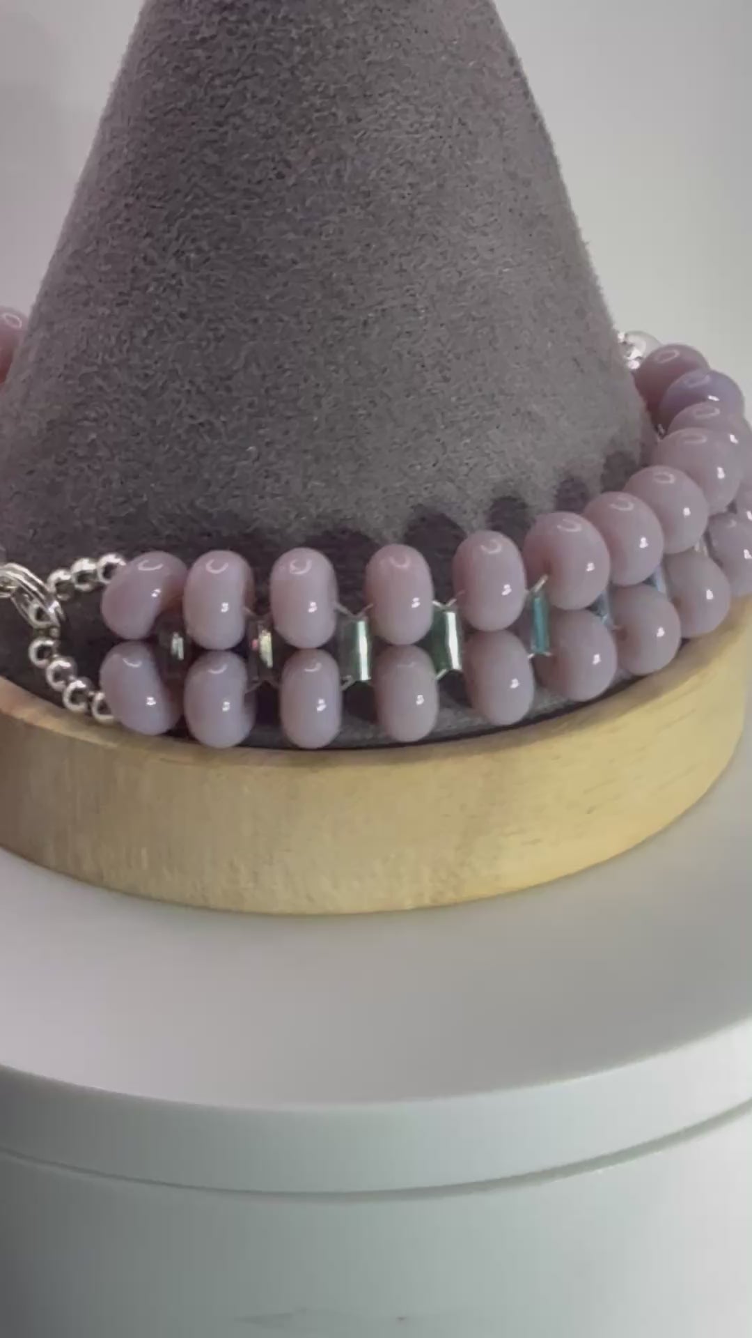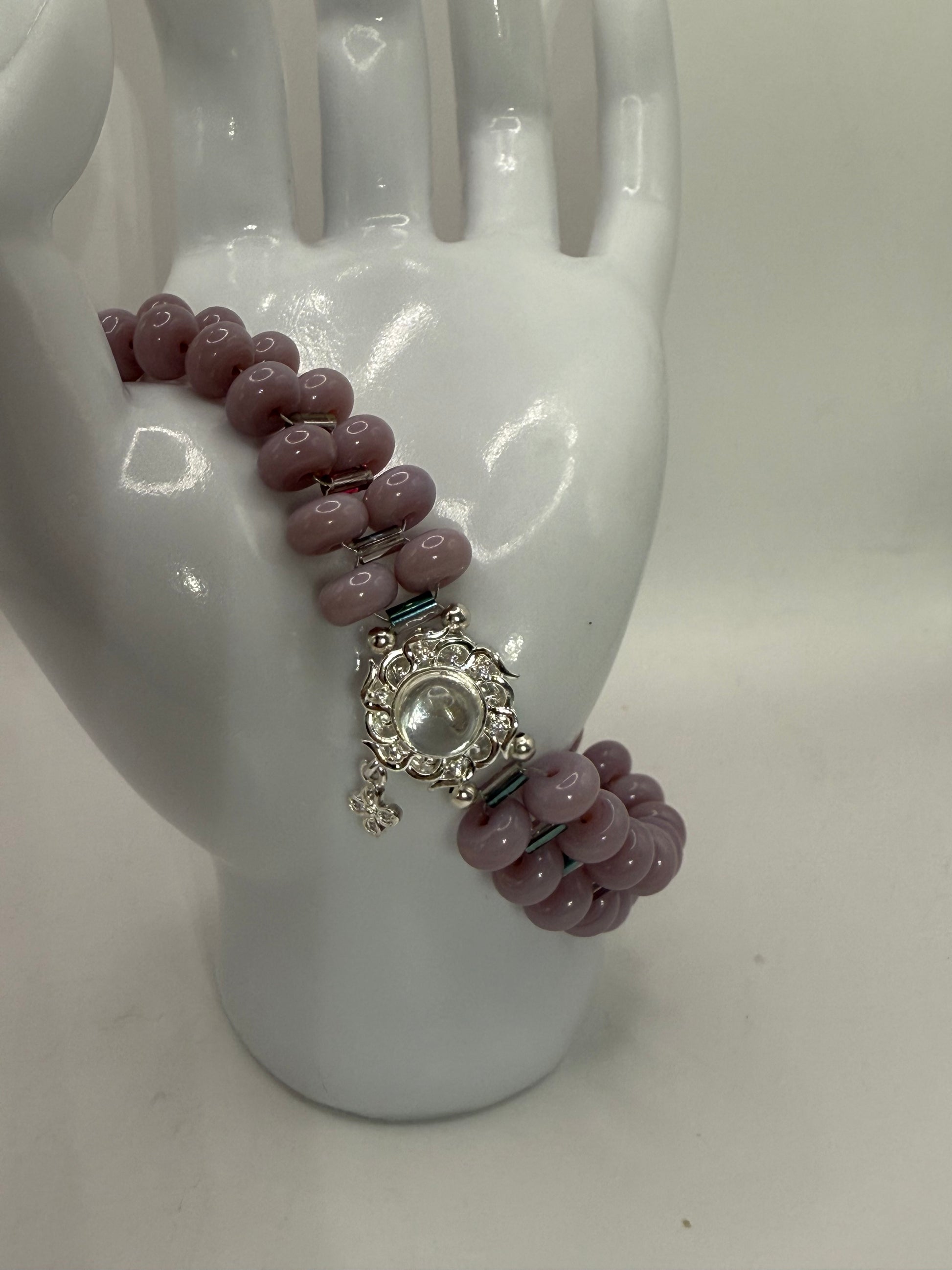 Handmade Double Band Mauve Glass Bead Clasp Bracelet – 8.25” Adjustable | Elegant Silver Floral Charm Jewelry