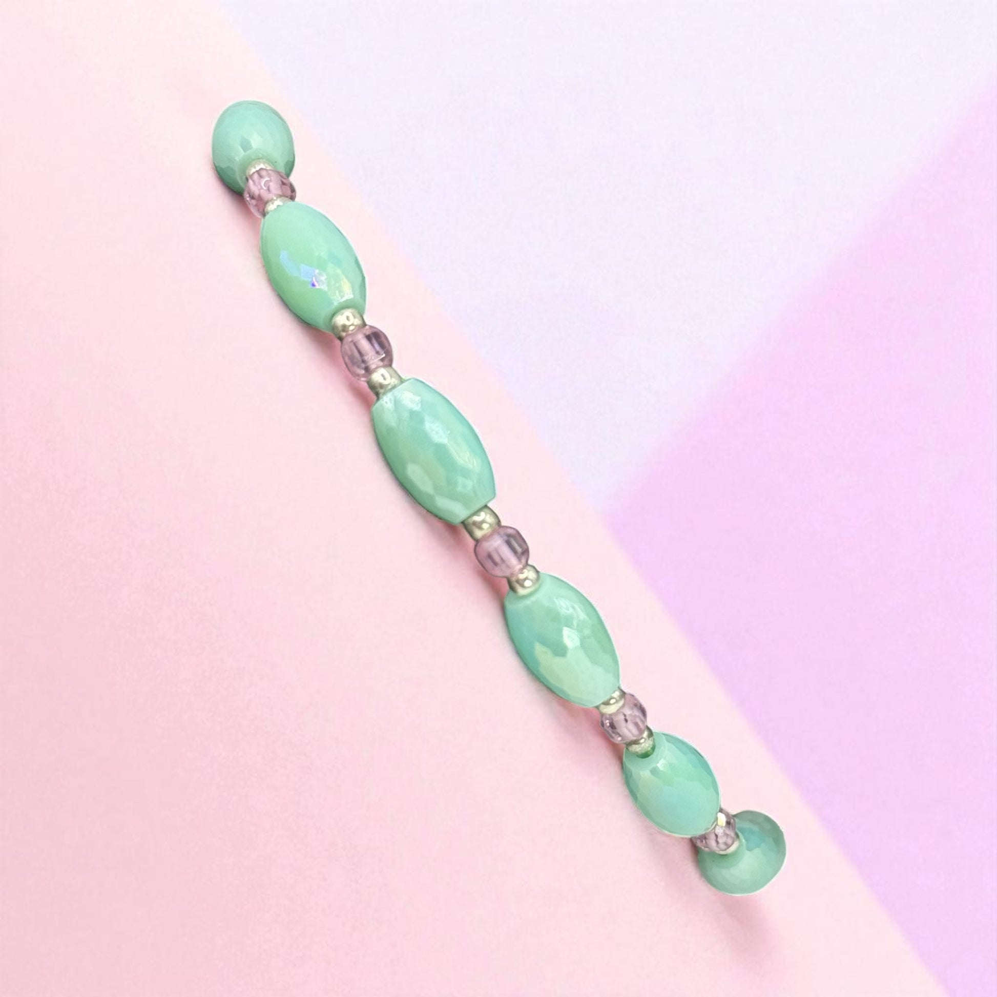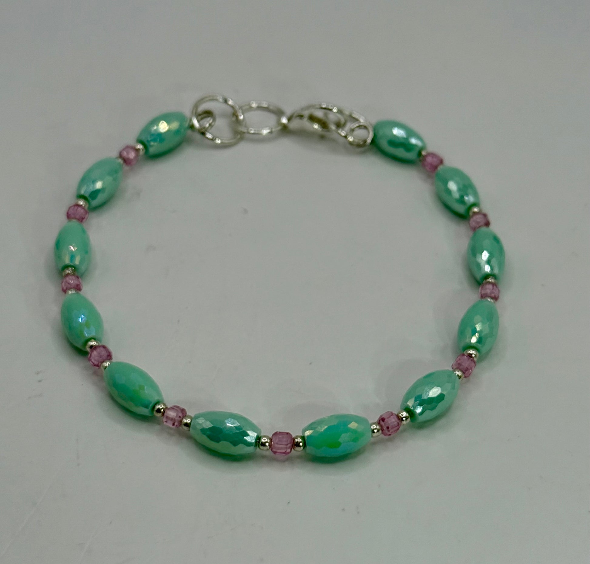 This 8” handmade bracelet combines soft seafoam green faceted glass beads with delicate pink accents and silver-tone spacers for a fresh, elegant style. The silver clasp ensures a secure fit, making it a perfect accessory for everyday wear or a thoughtful gift.