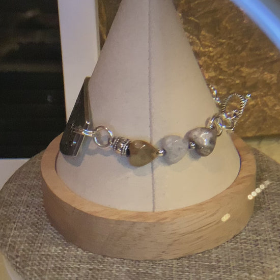 \nBoost your mood and elevate your style with our Happy Thoughts bracelet! A beautiful combination of agate and a motivational message on the buckle, this 7.25"-7.5" bracelet adds a touch of positivity to your outfit. Perfect for daily wear, it's a unique piece that'll remind you to think happy thoughts.
