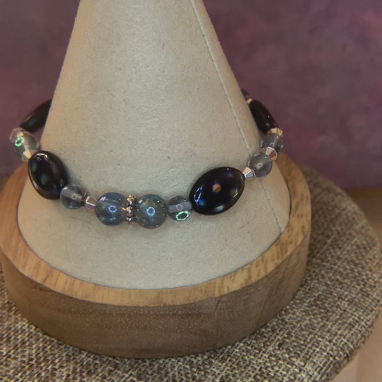 Add a touch of Indigo Glow to any outfit with this elastic bracelet made with blue etched glass beads and a reflective gray stone. Perfect for any occasion, day or night. Can be resized upon request.