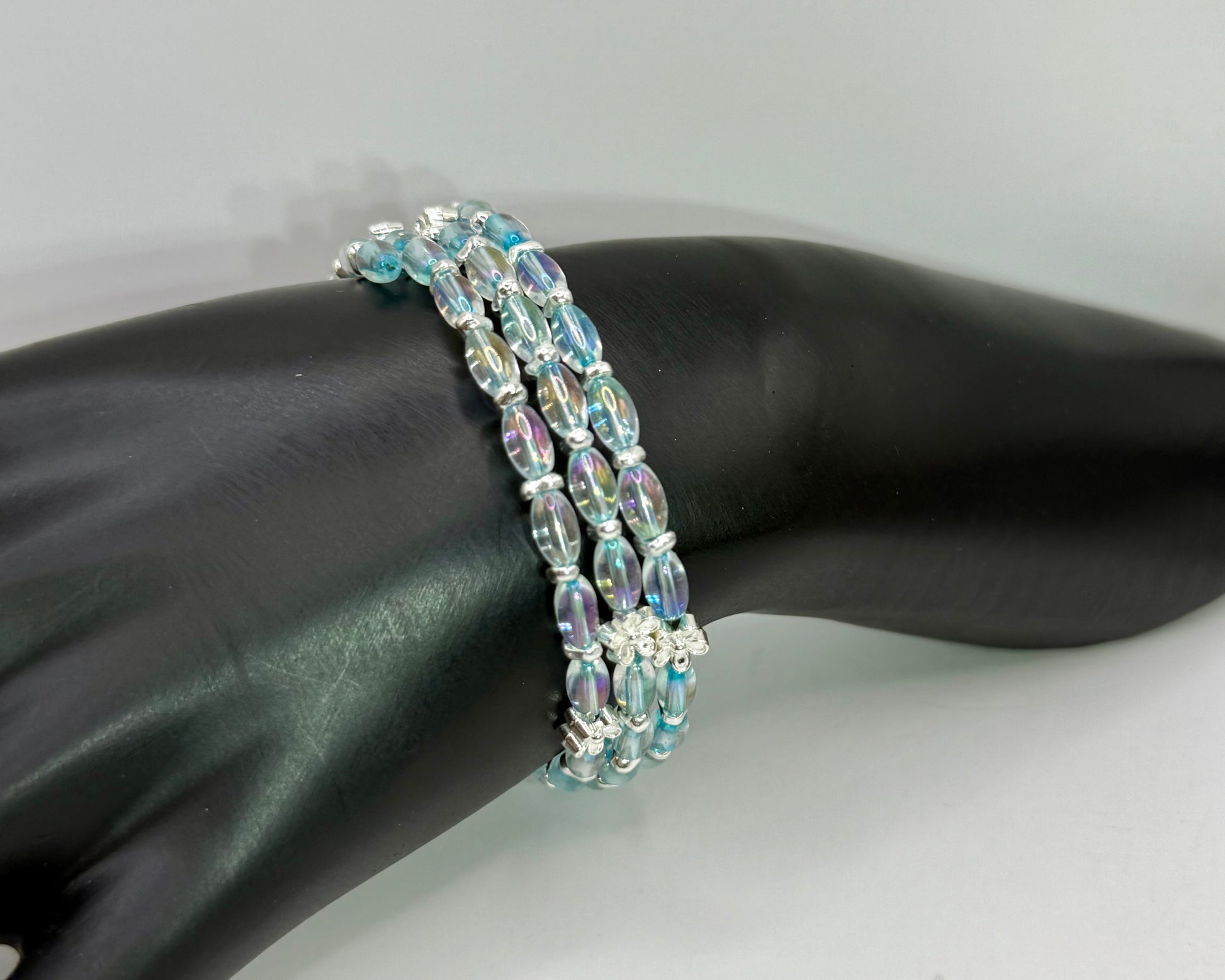 This elegant iridescent glass wrap bracelet features soft, light-reflective beads paired with silver accents for a clean and modern style. The triple-layer design wraps comfortably around your wrist, creating a stylish stacked look that’s perfect for everyday wear or special occasions.