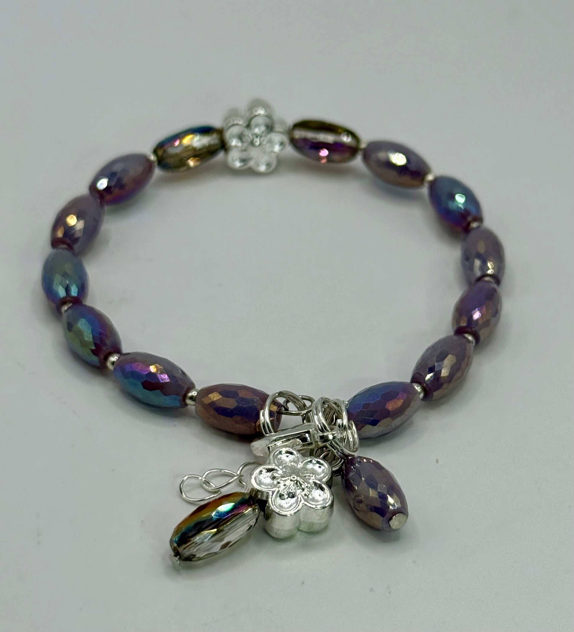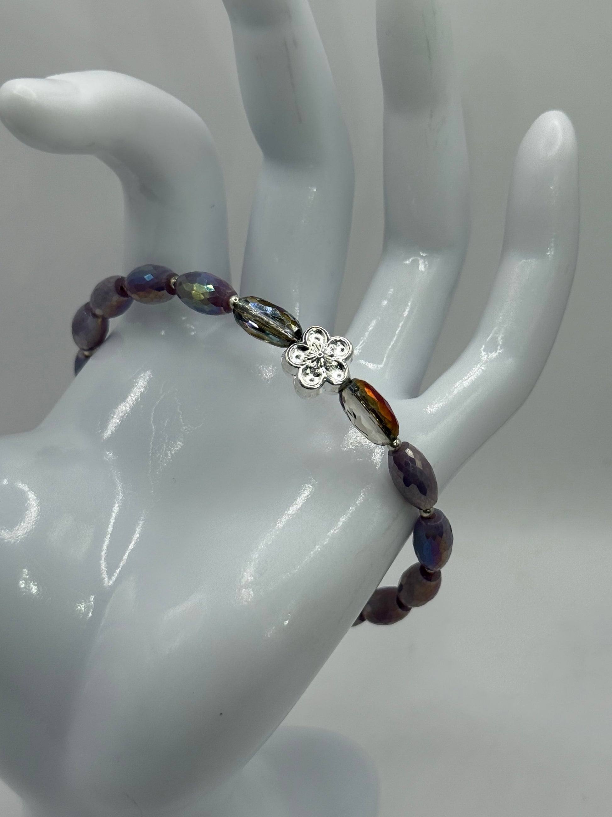 iridescent bracelet, purple glass bracelet, bronze bead jewelry, flower charm bracelet, handmade bracelet for her, sparkly glass bead bracelet, gift for women, elegant clasp bracelet, beaded bracelet handmade, silver charm jewelry, affordable handmade jewelry, boho glam bracelet, LuckyCharm Boutique TX