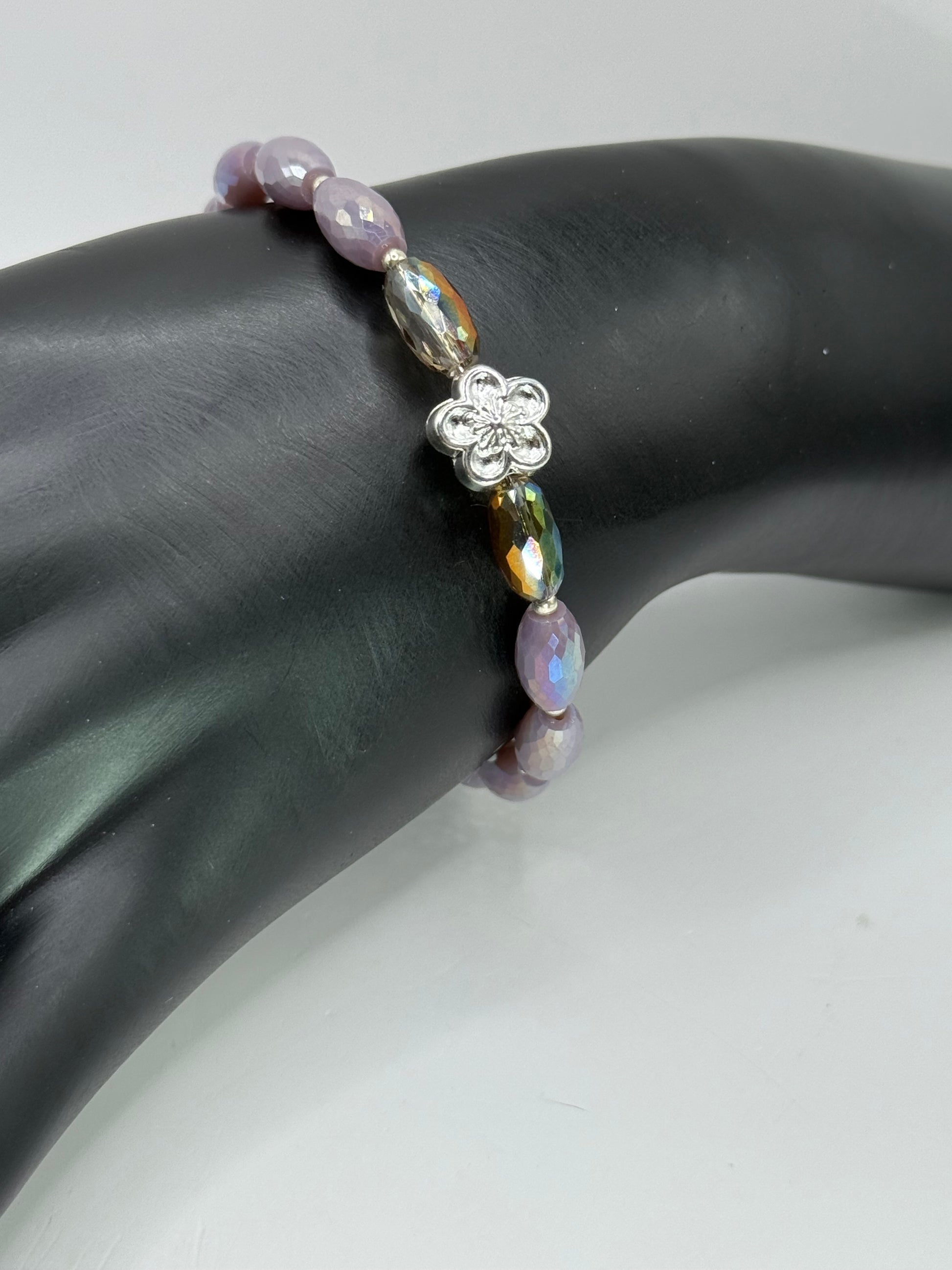 - Material: Faceted iridescent glass beads, silver-tone metal accents, floral charm
