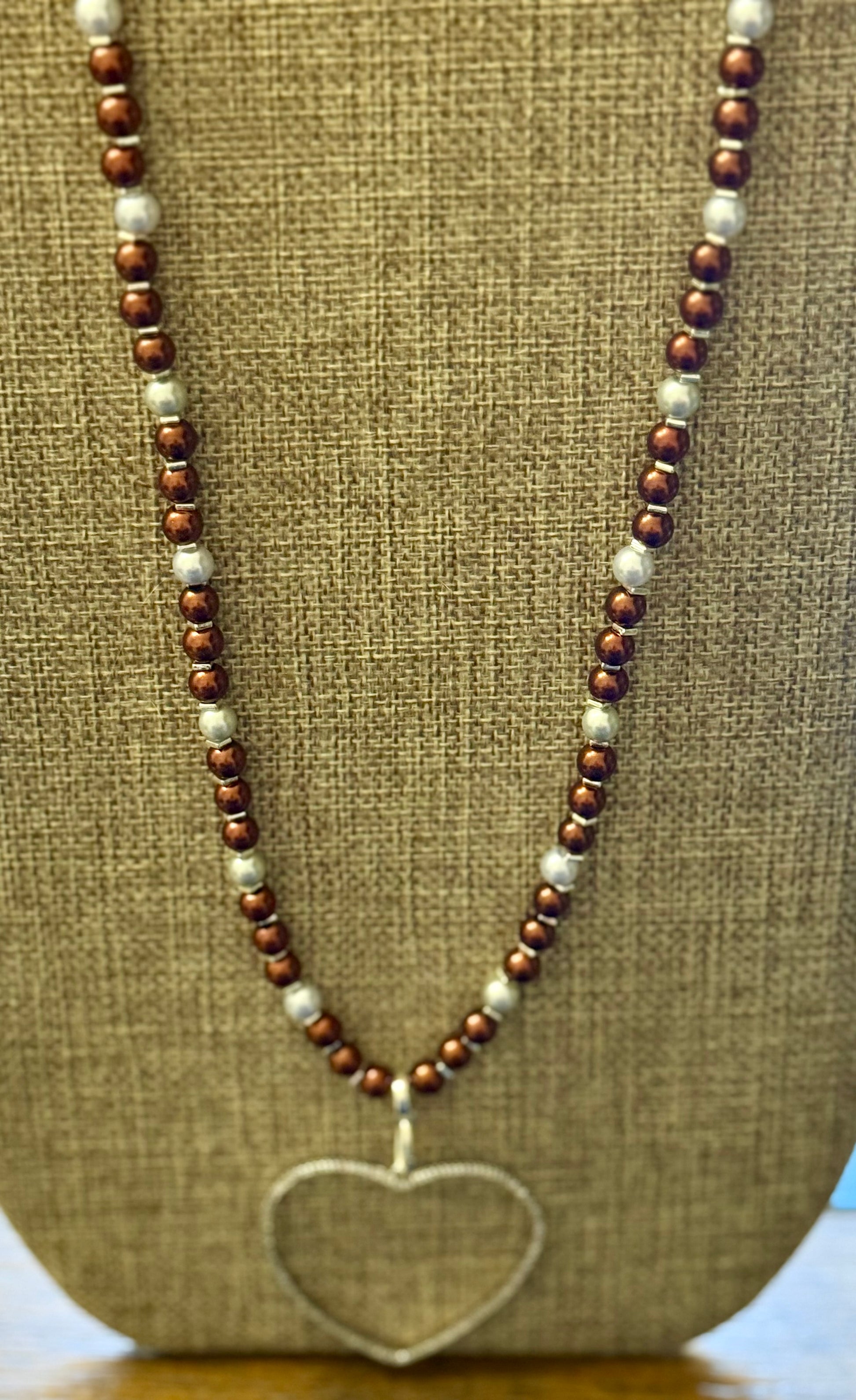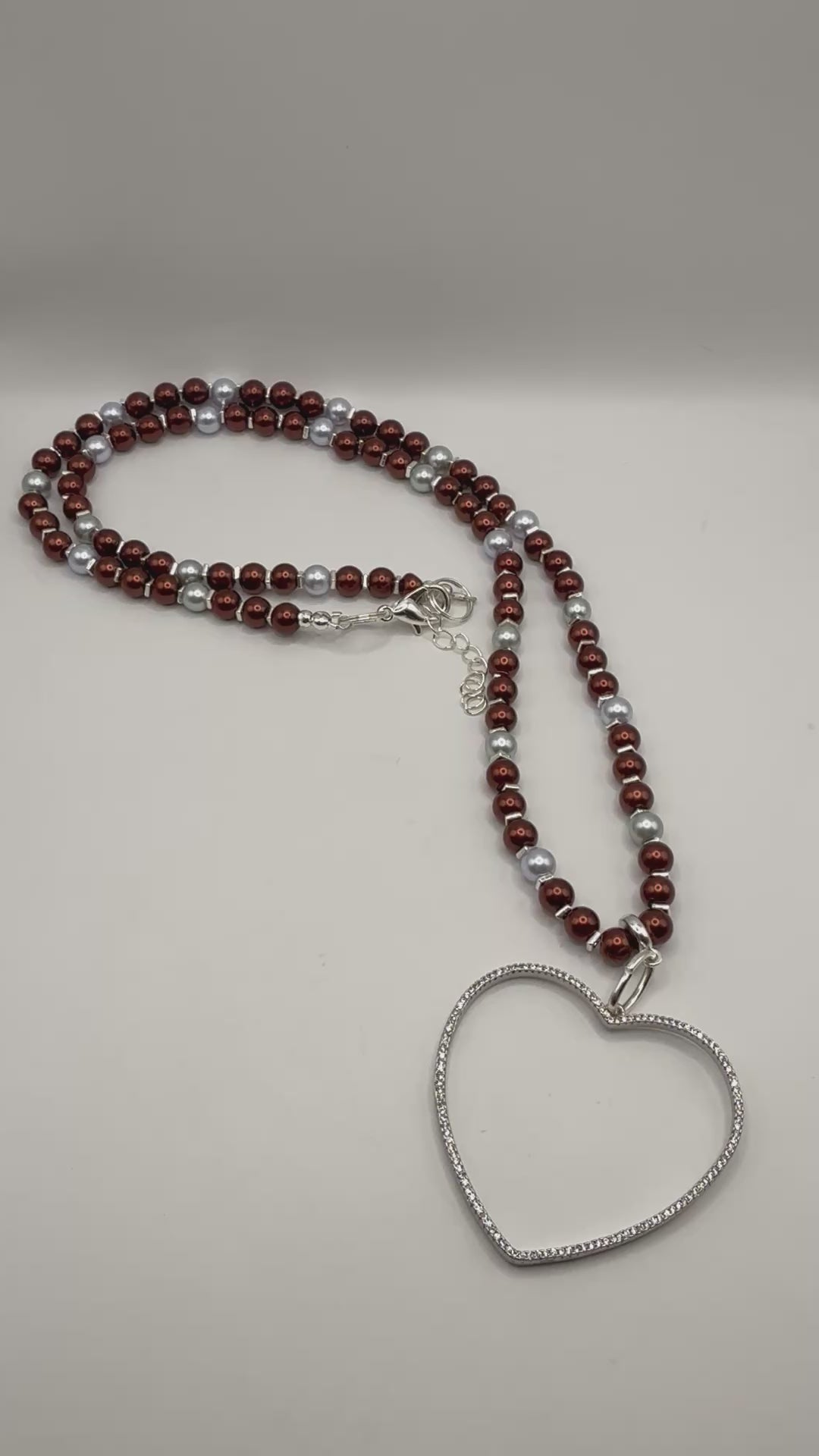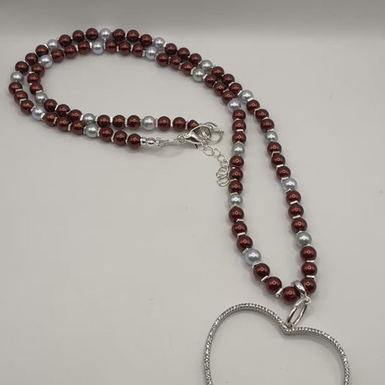 Ivory & Burgundy Glass Pearl Necklace – 26” Beaded Heart Pendant – Handmade Statement Jewelry – Elegant Gift for Her – Anniversary Necklace