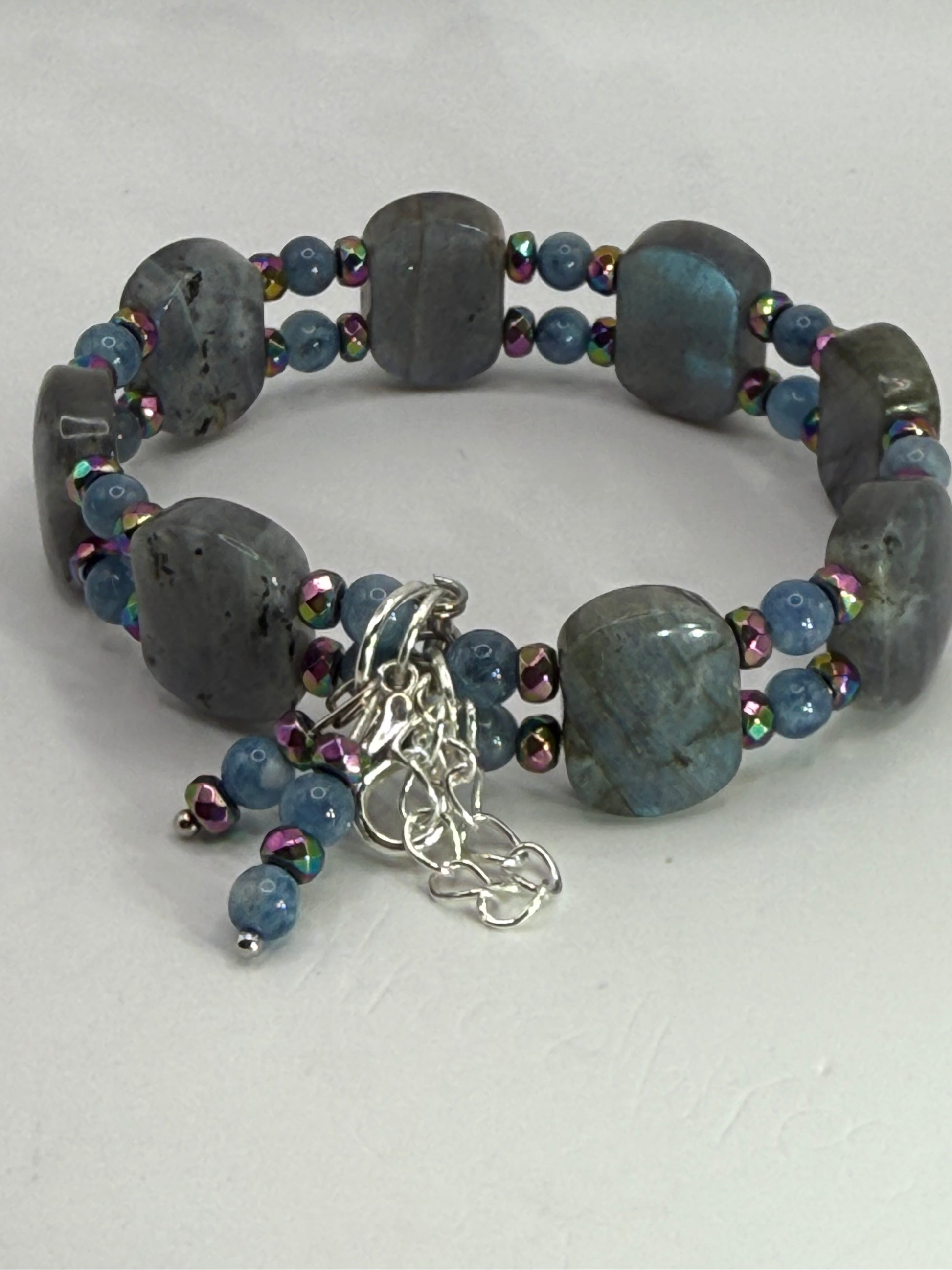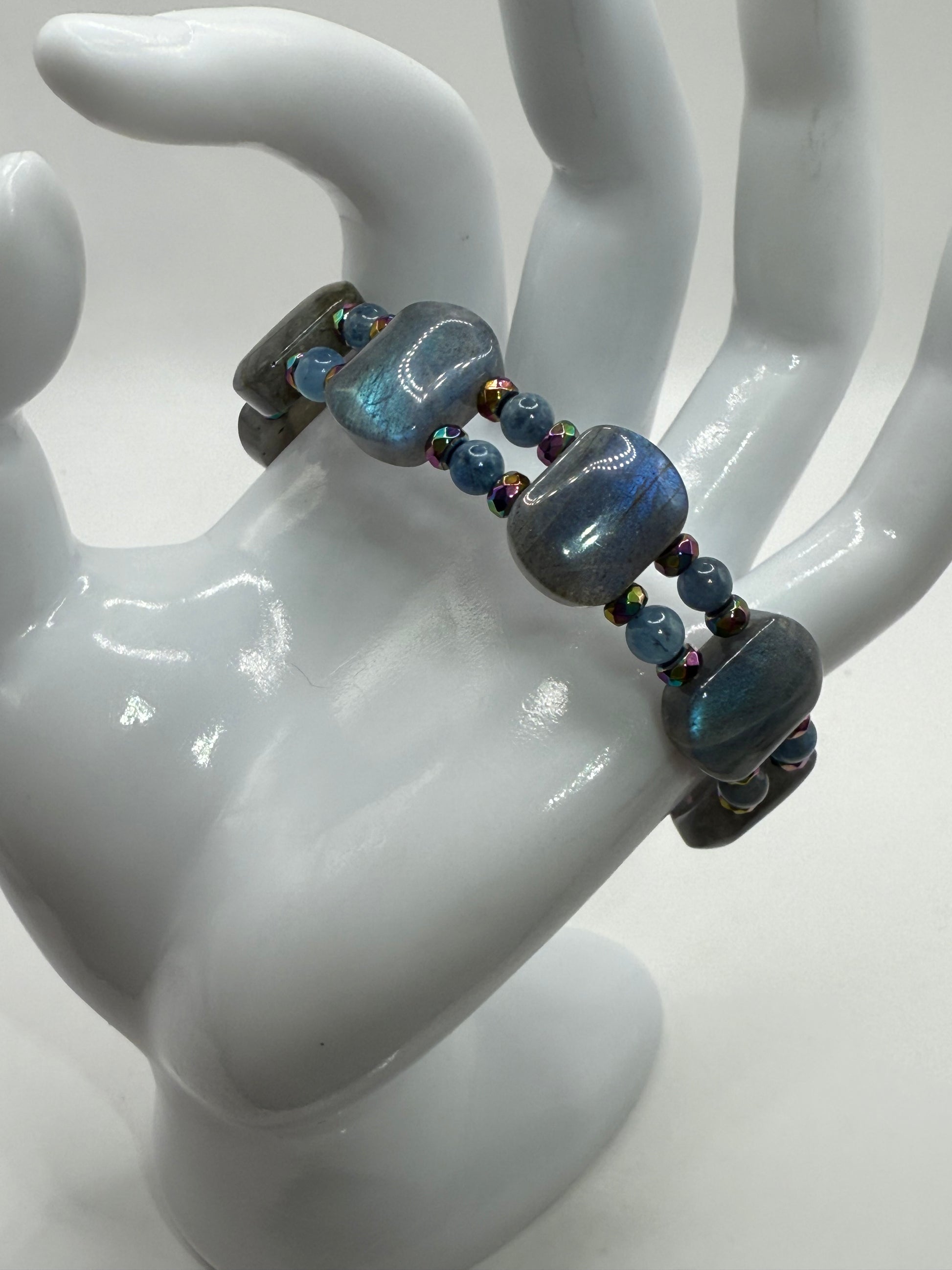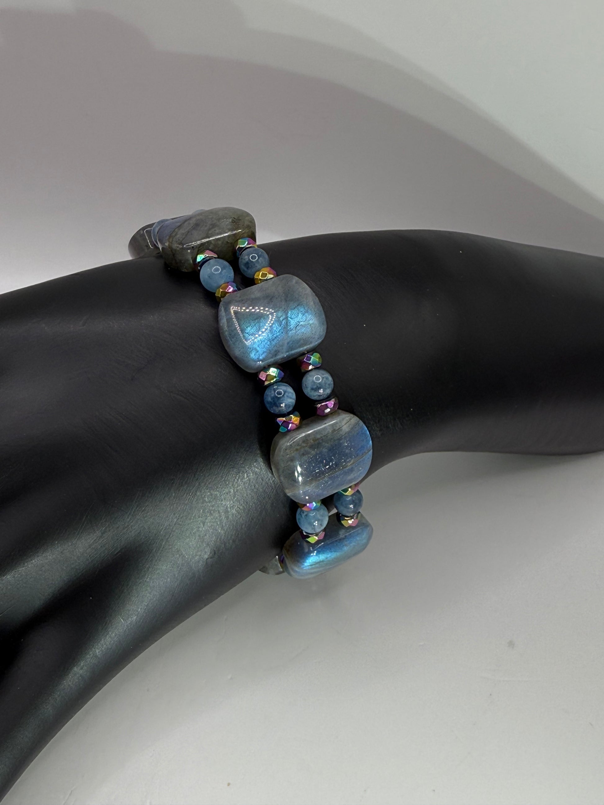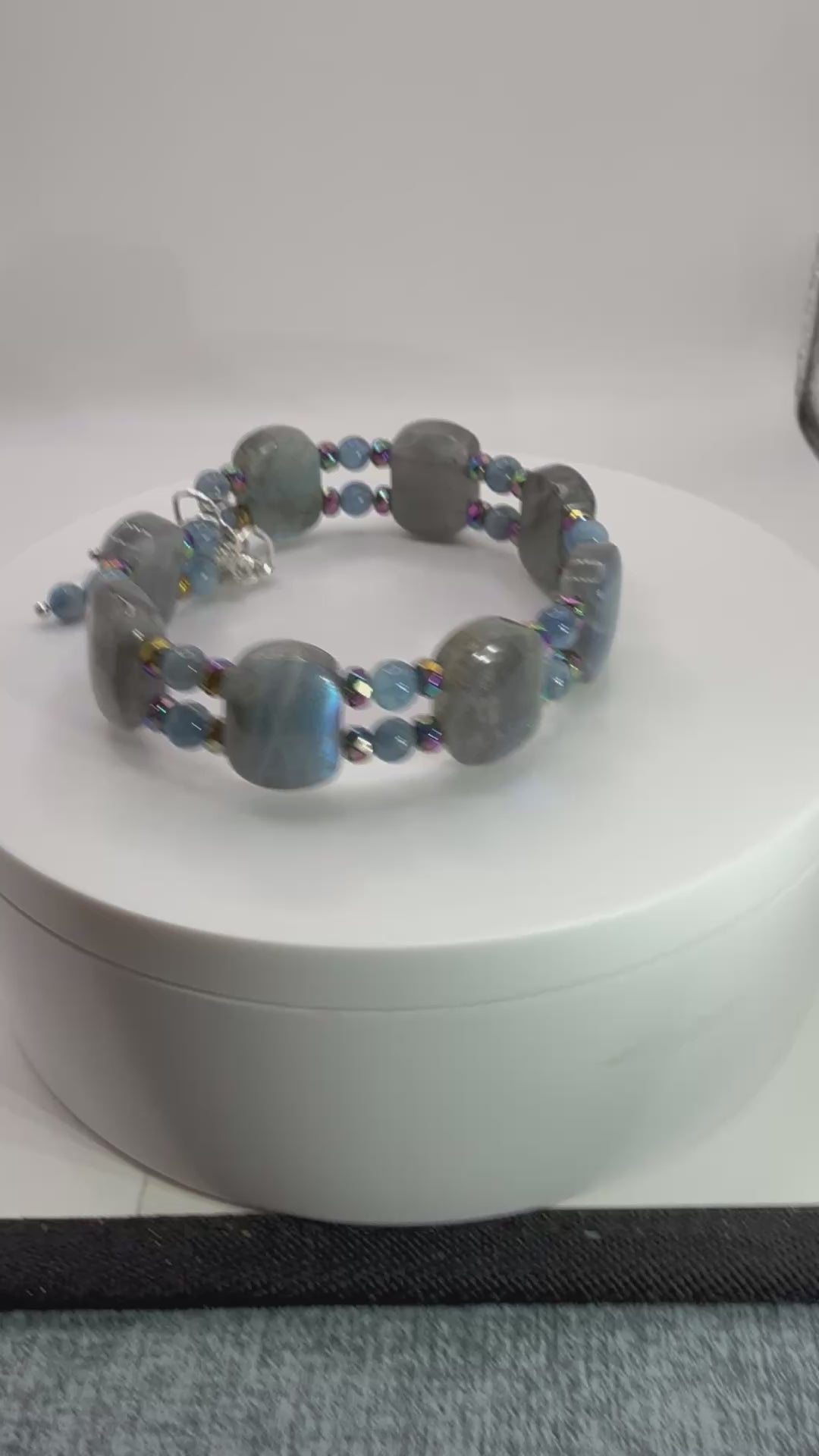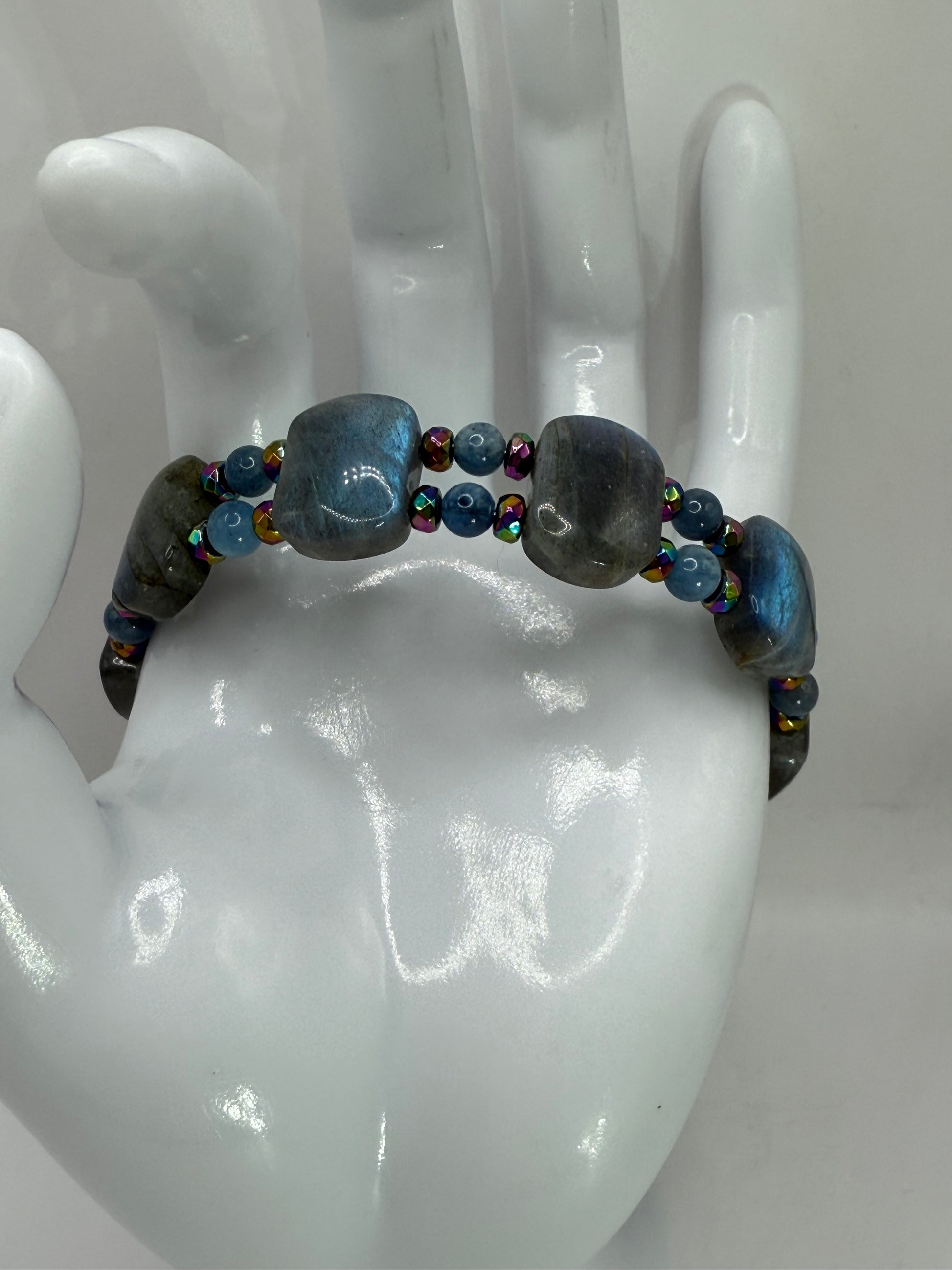 This bracelet is even more breathtaking in person—the pictures simply don’t do it justice! ✨ Handcrafted with glowing labradorite, soothing aquamarine, and shimmering rainbow hematite, this double bangle clasp bracelet radiates elegance and energy. The natural labradorite flashes with mesmerizing blue fire, perfectly complemented by the soft aqua tones of aquamarine and the iridescent shimmer of hematite spacers.