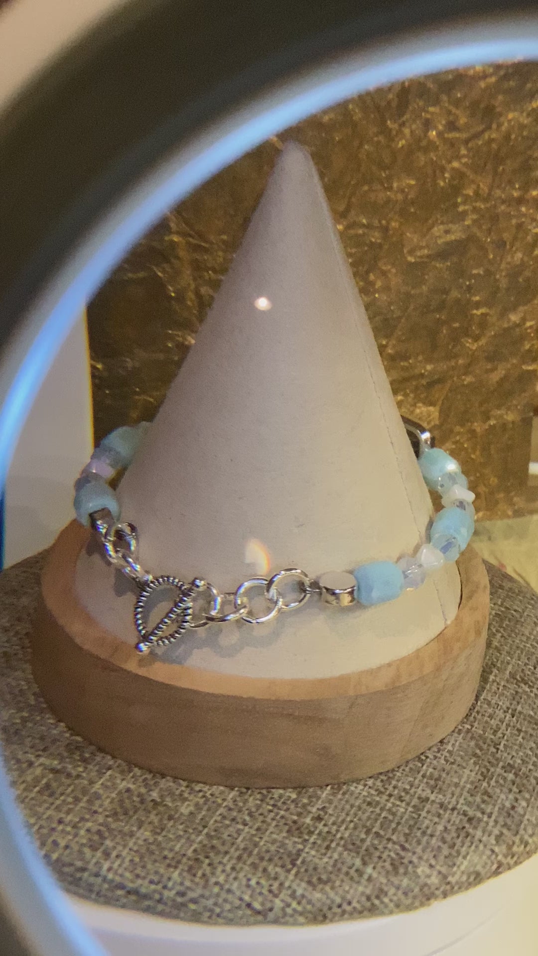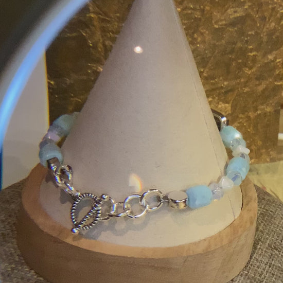 \nShine bright like the stars with our Moon Glow bracelet. This unique piece features mesmerizing gray moonstone and opalite, accented with charming baby blue Czech glass stones. And, for a perfect fit, we can resize it upon request. Who says you can't have it all?
