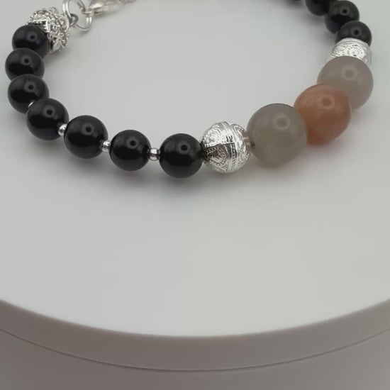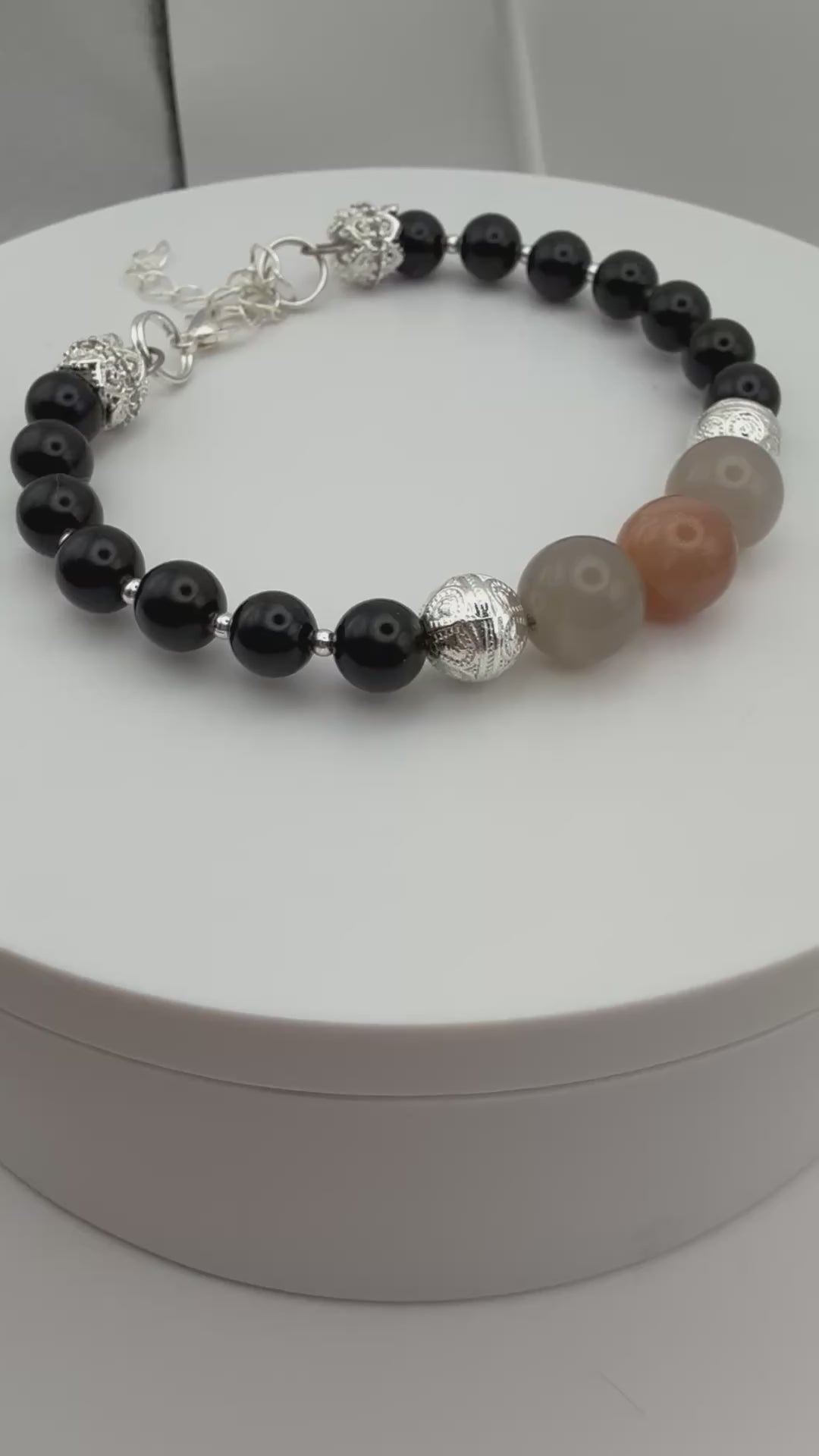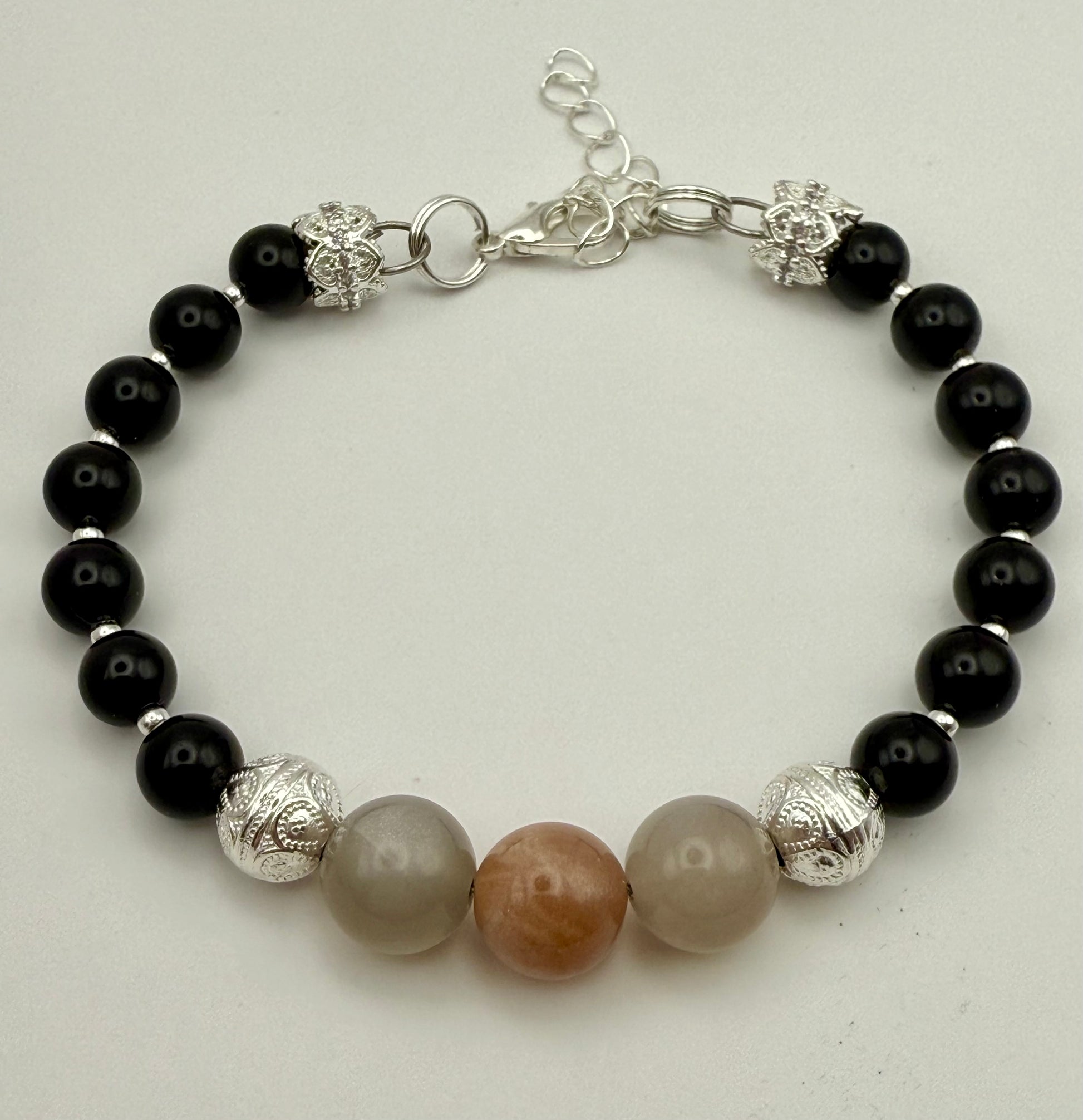 Onyx Bracelet with black and pink moonstone focal 7.25-7.5"