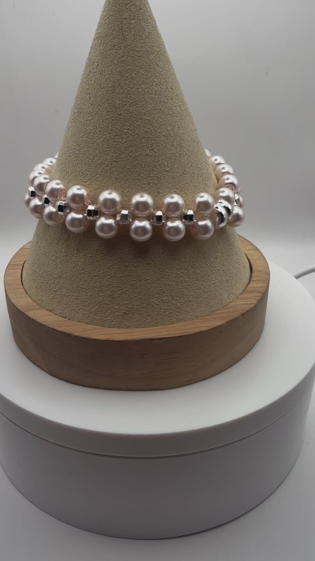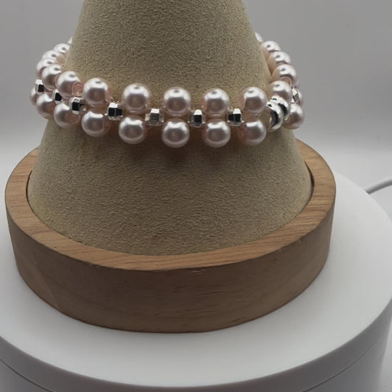 This elegant bracelet showcases soft pastel pink glass pearls accented with silver, creating a timeless and sophisticated look. The comfortable elastic band is ideally sized for a 7.5" wrist, but can be resized upon request. Enjoy the subtle beauty and versatility of this accessory.