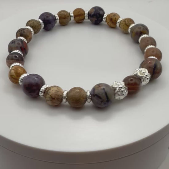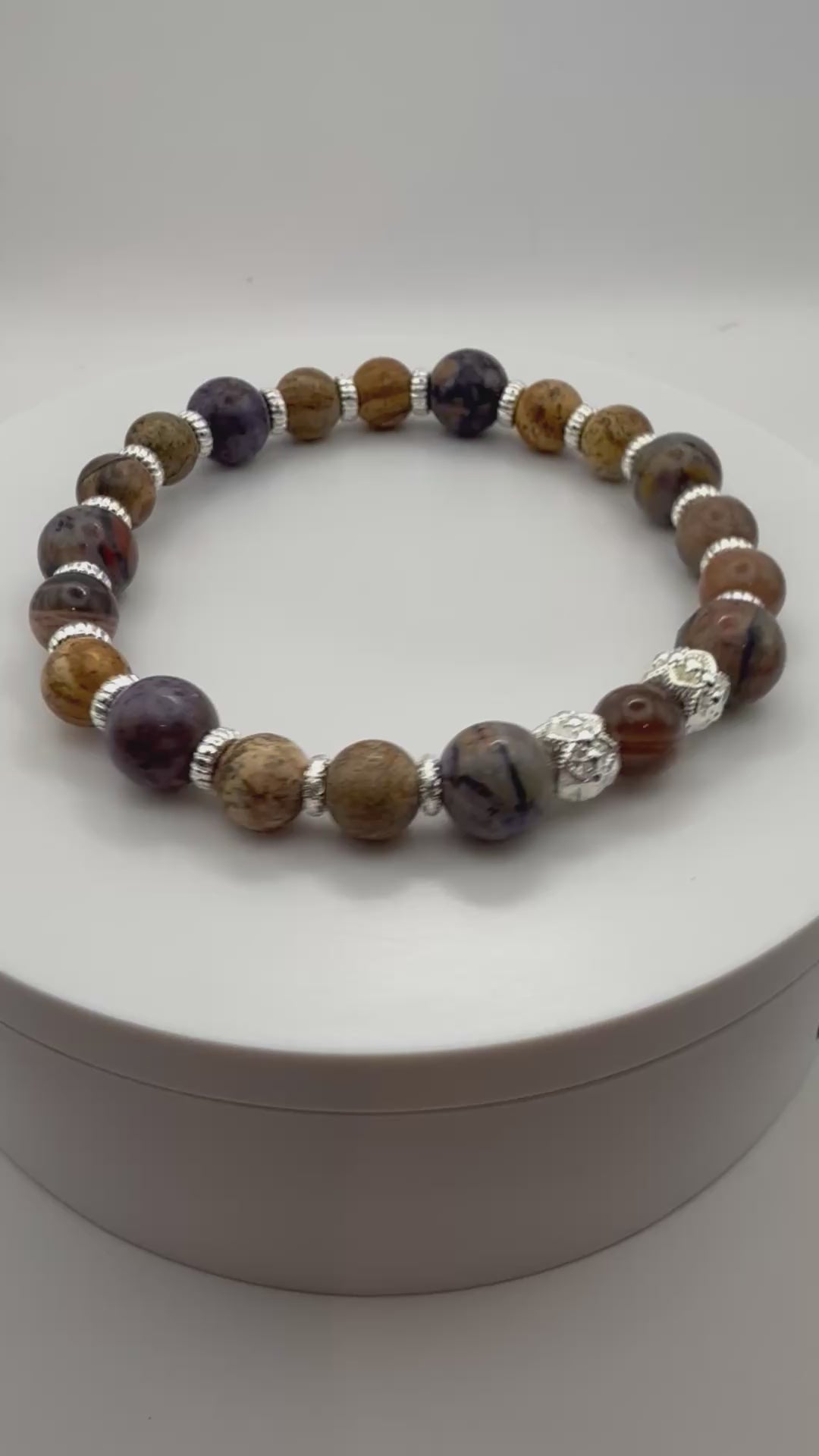 This stunning bracelet features earthy tones of Picasso Jasper and fluorite root stone, complemented by bright silver accents. With an ideal size of 7.75", this elastic bracelet is the perfect addition to any jewelry collection. We also offer resizing upon purchase. Elevate your style with the natural beauty and energy of these stones.