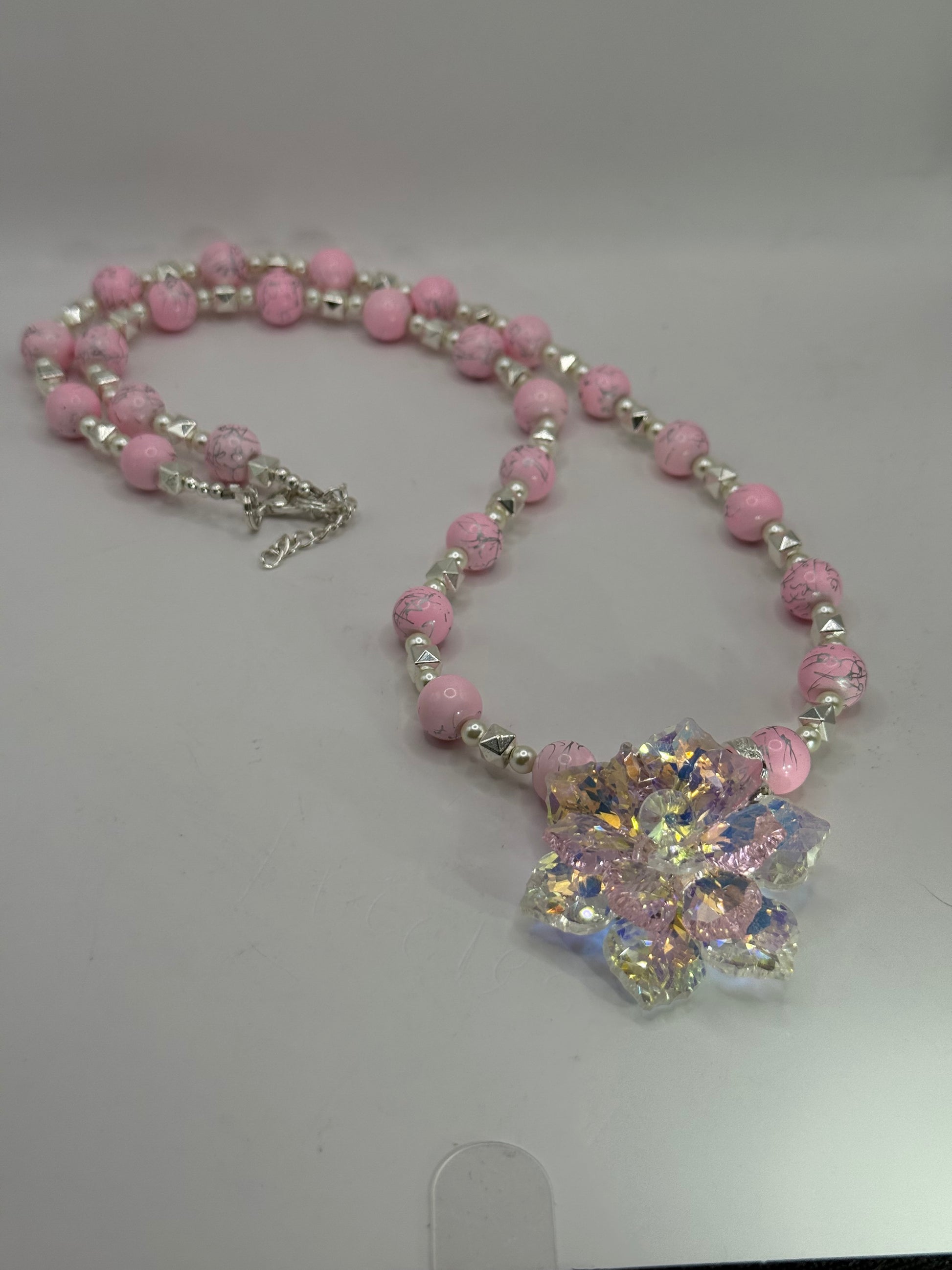 Bring a touch of sparkle and charm to your look with this handmade 26-inch necklace, featuring soft pink marbled beads, silver-tone accents, and a stunning iridescent crystal flower pendant that glimmers with every movement. This elegant piece comes with a matching bracelet 8" and earrings, making it a complete jewelry set perfect for dressing up or gifting.