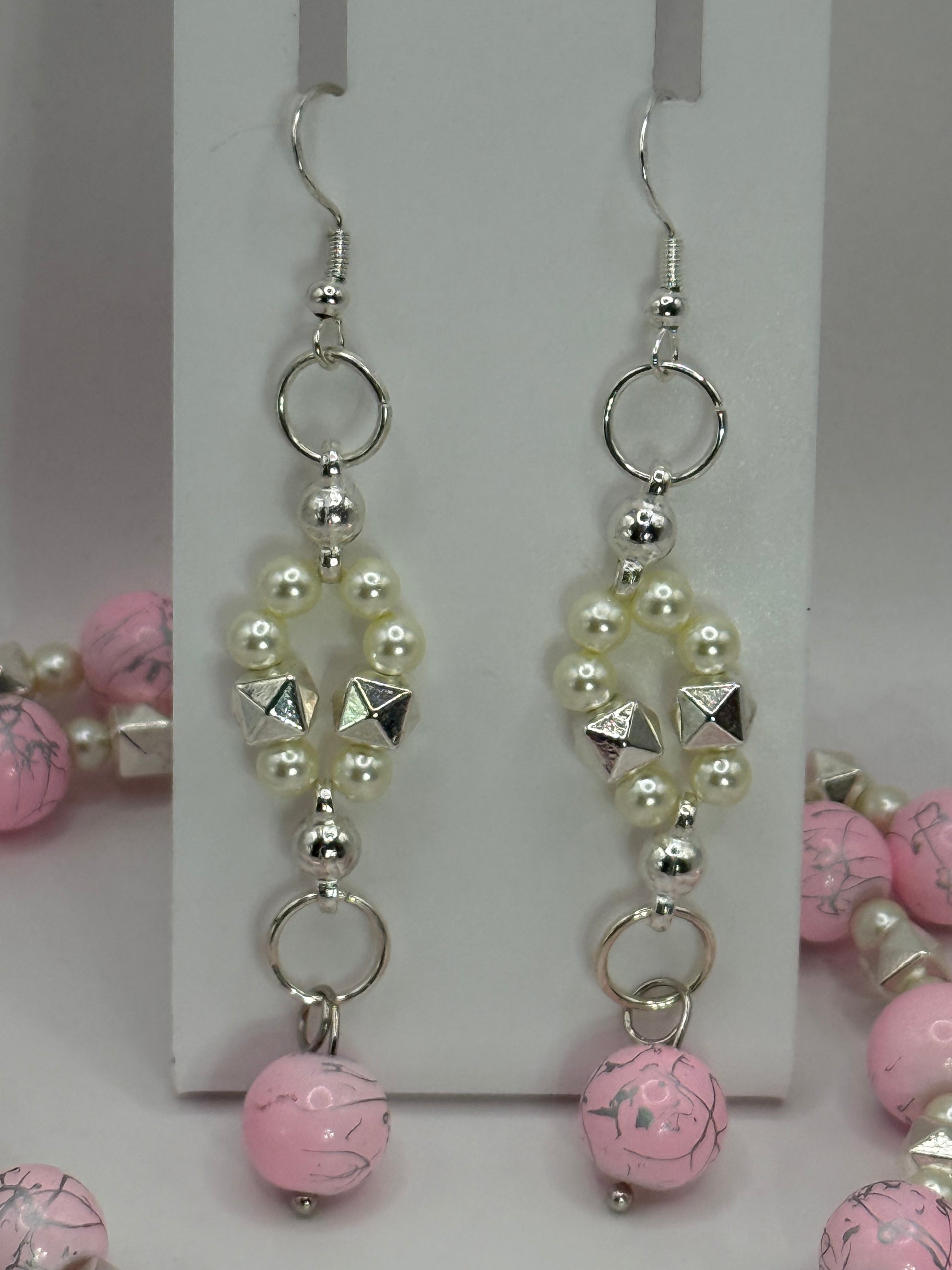 - Beads: Pink marbled rounds, silver pyramid spacers, and pearl accents