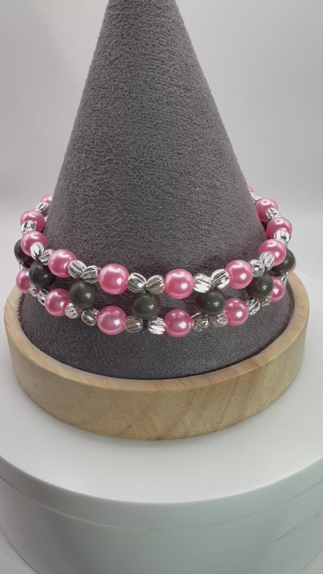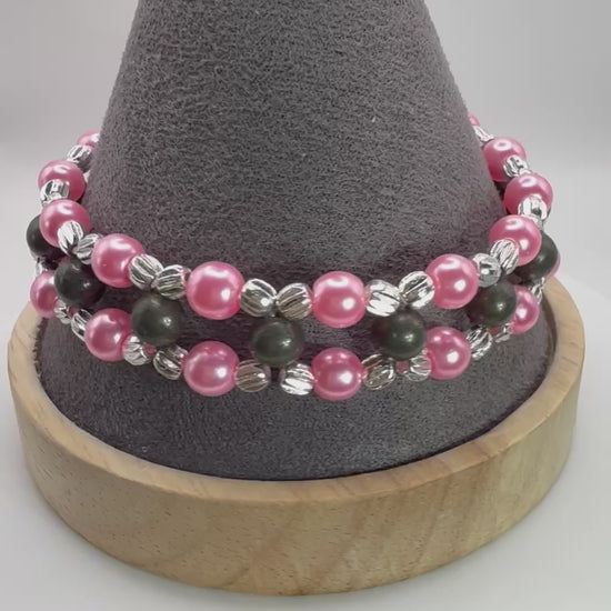 This stunning handmade double strand bracelet blends the timeless elegance of pink glass pearls with the grounding strength of pyrite gemstones. Accented with silver-tone textured spacers, it’s a chic piece designed to turn heads while carrying deeper meaning.