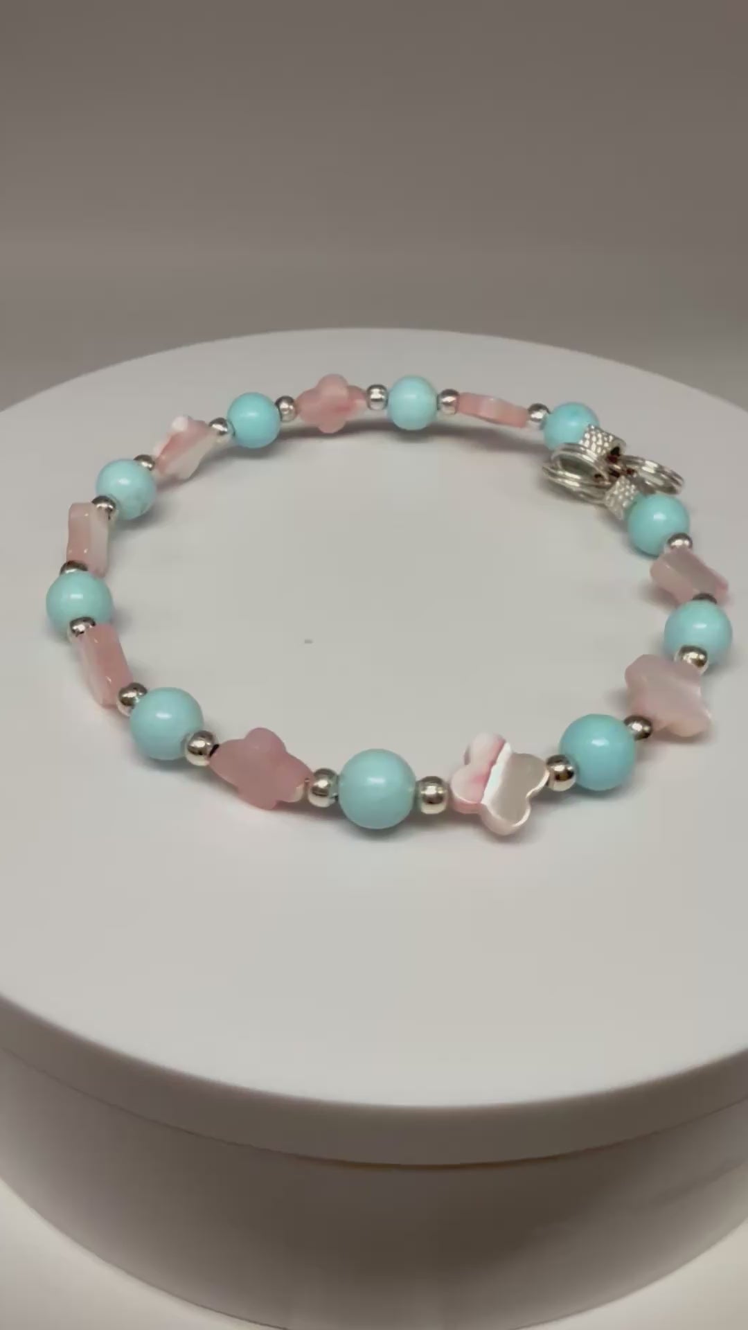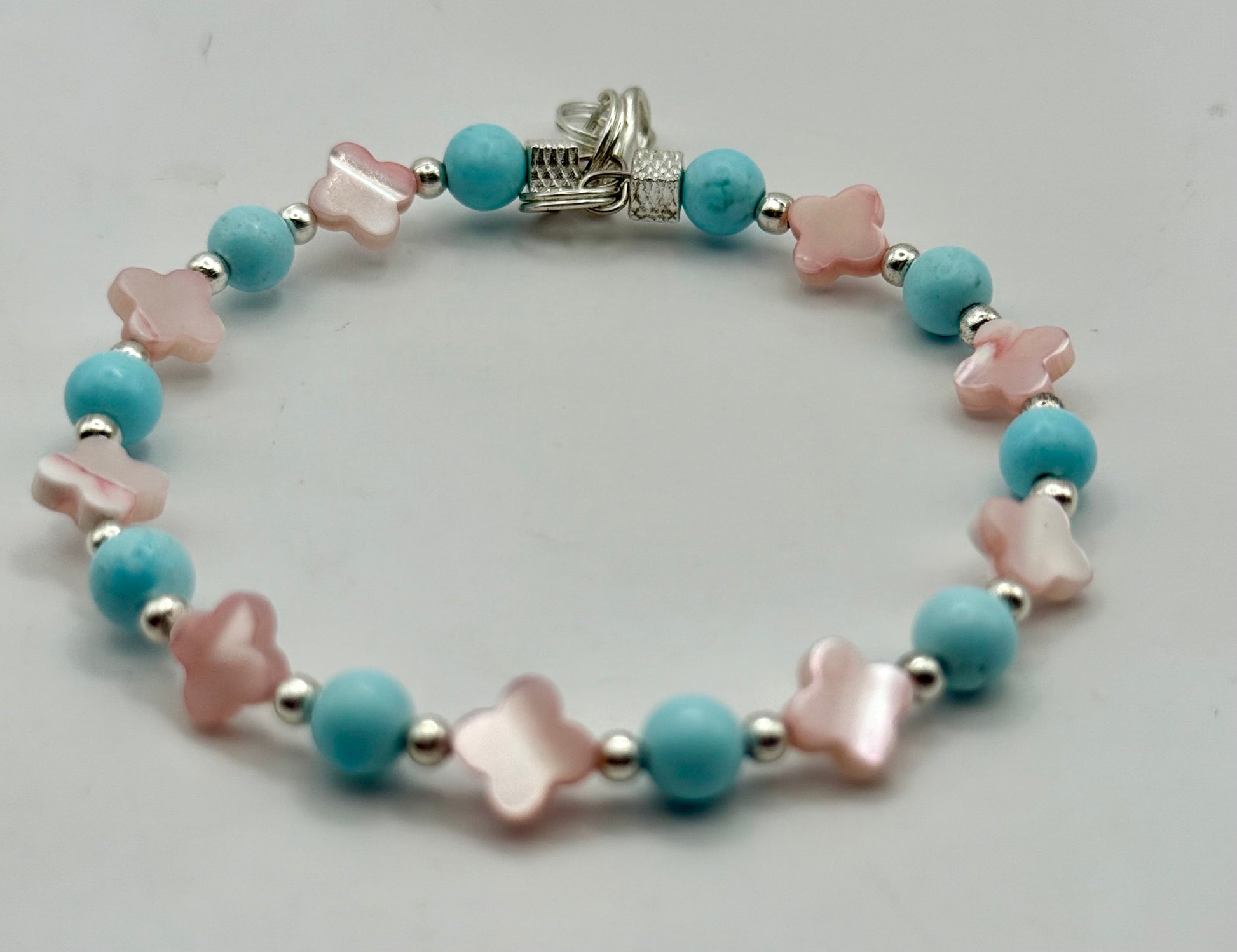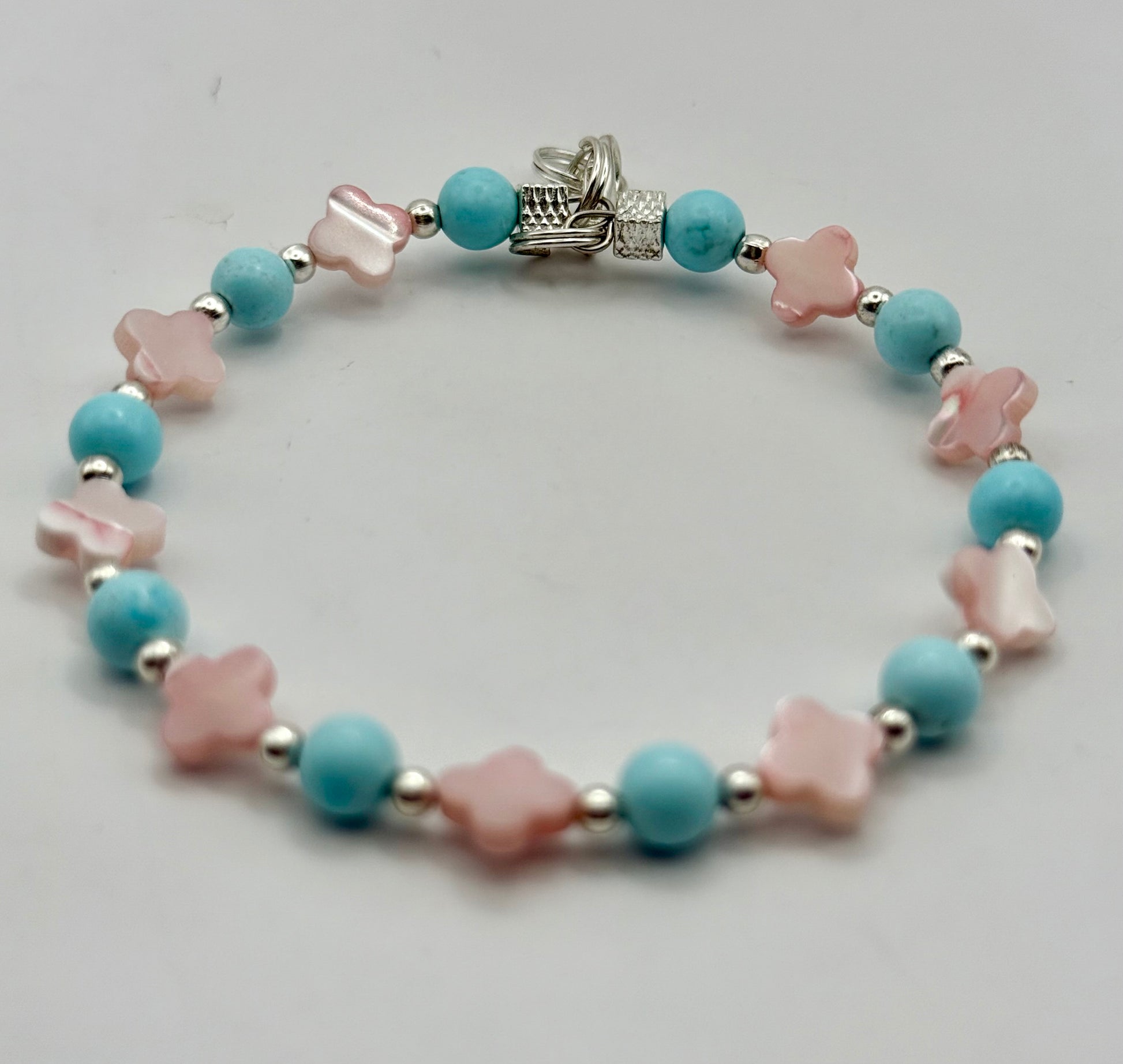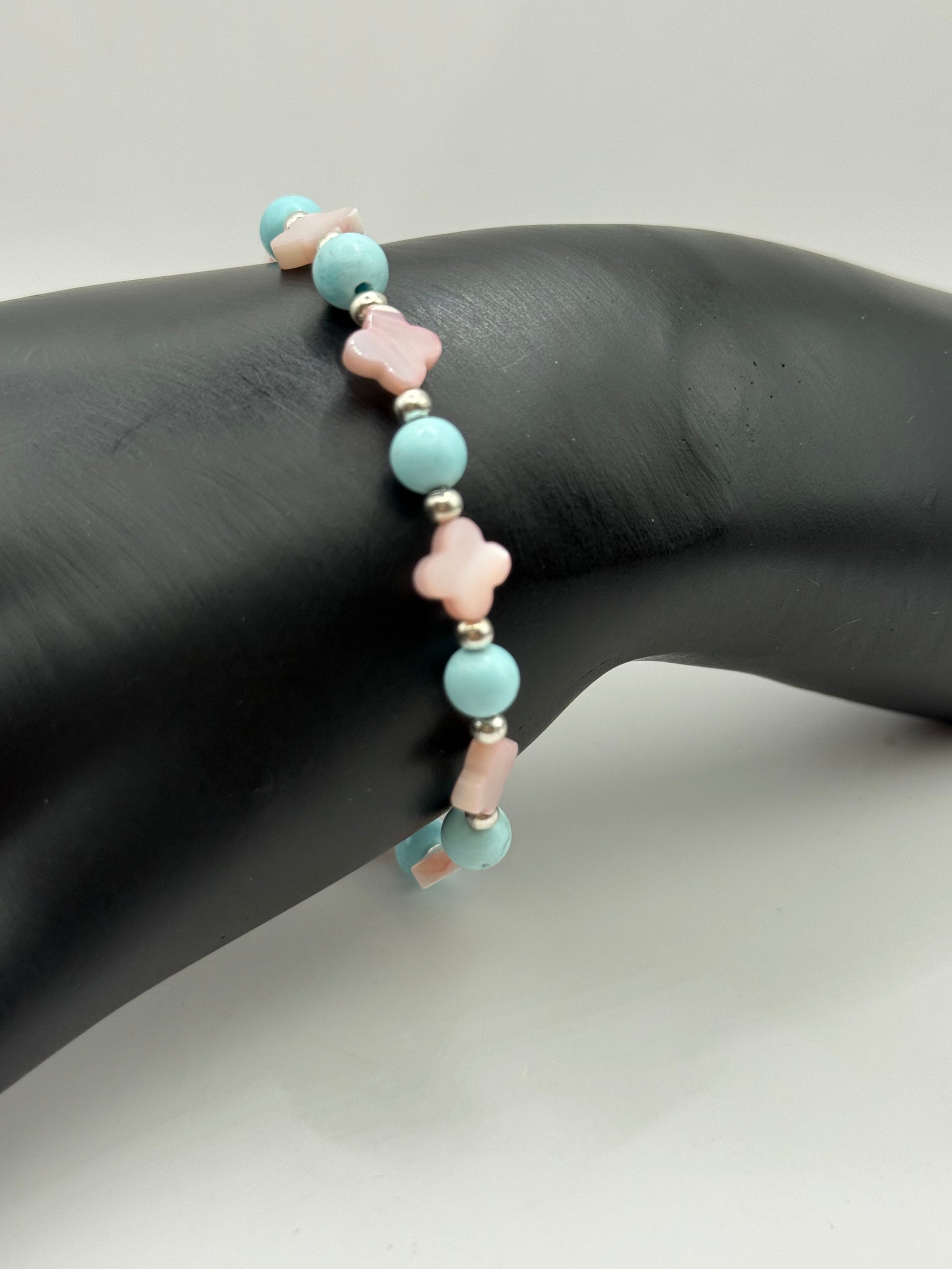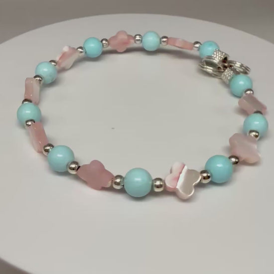 This bracelet pairs the calming hues of sky blue and soft pink with a touch of shimmer, creating a look that’s both feminine and fresh. The secure clasp makes it easy to wear all day.