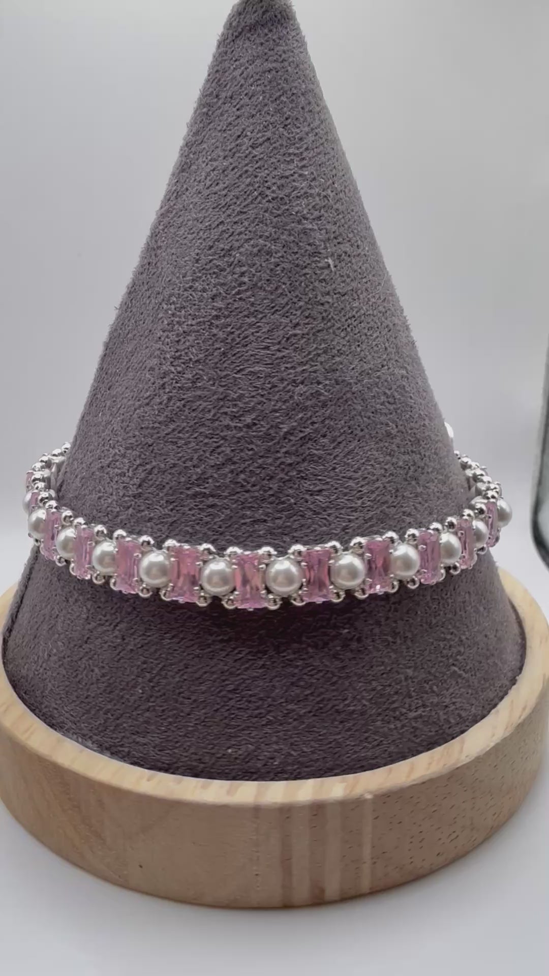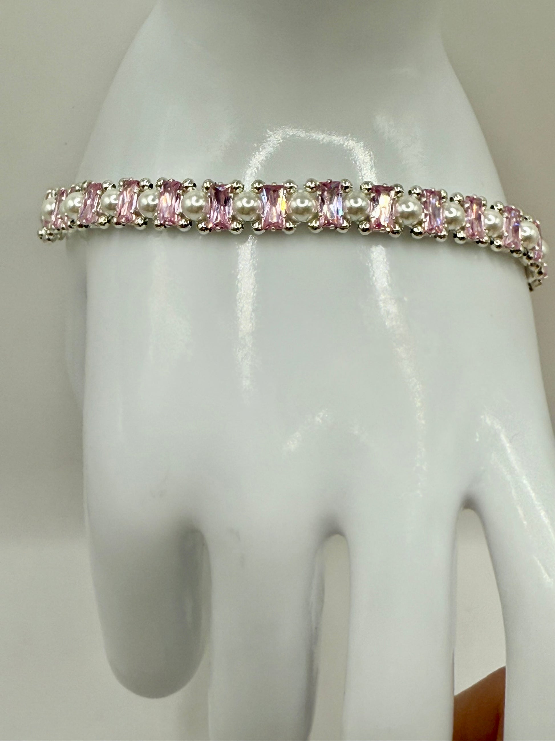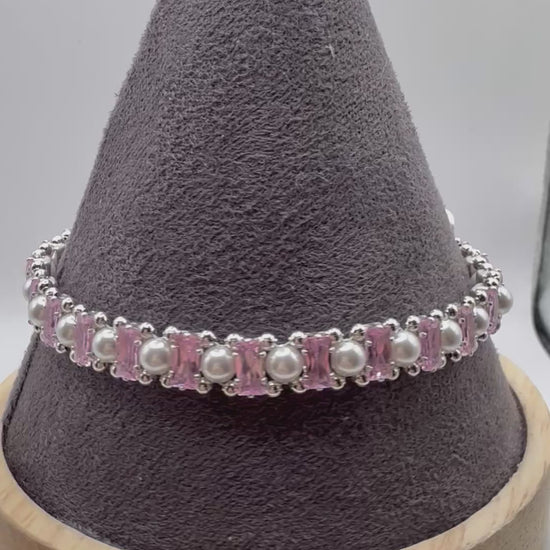 Romantic, feminine, and timelessβthis pink rhinestone and white glass pearl clasp bracelet is the perfect finishing touch for any outfit. Featuring alternating sparkling pink baguette-cut rhinestones and lustrous white glass pearls, this bracelet delivers a sophisticated blend of shimmer and elegance.