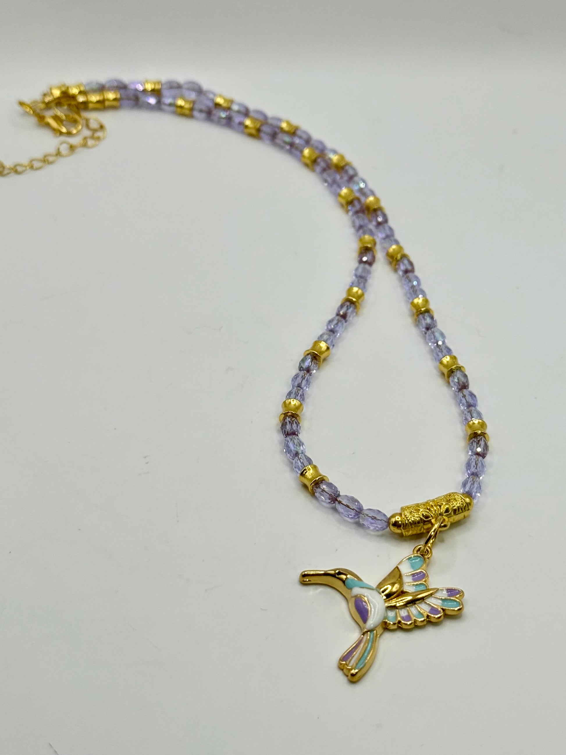 hummingbird necklace, purple glass necklace, sparkly beaded necklace, hummingbird pendant jewelry, faceted glass necklace, handmade jewelry set, hummingbird jewelry gift, 18 inch necklace, purple beaded necklace, boho chic necklace, bird lover gift, statement necklace