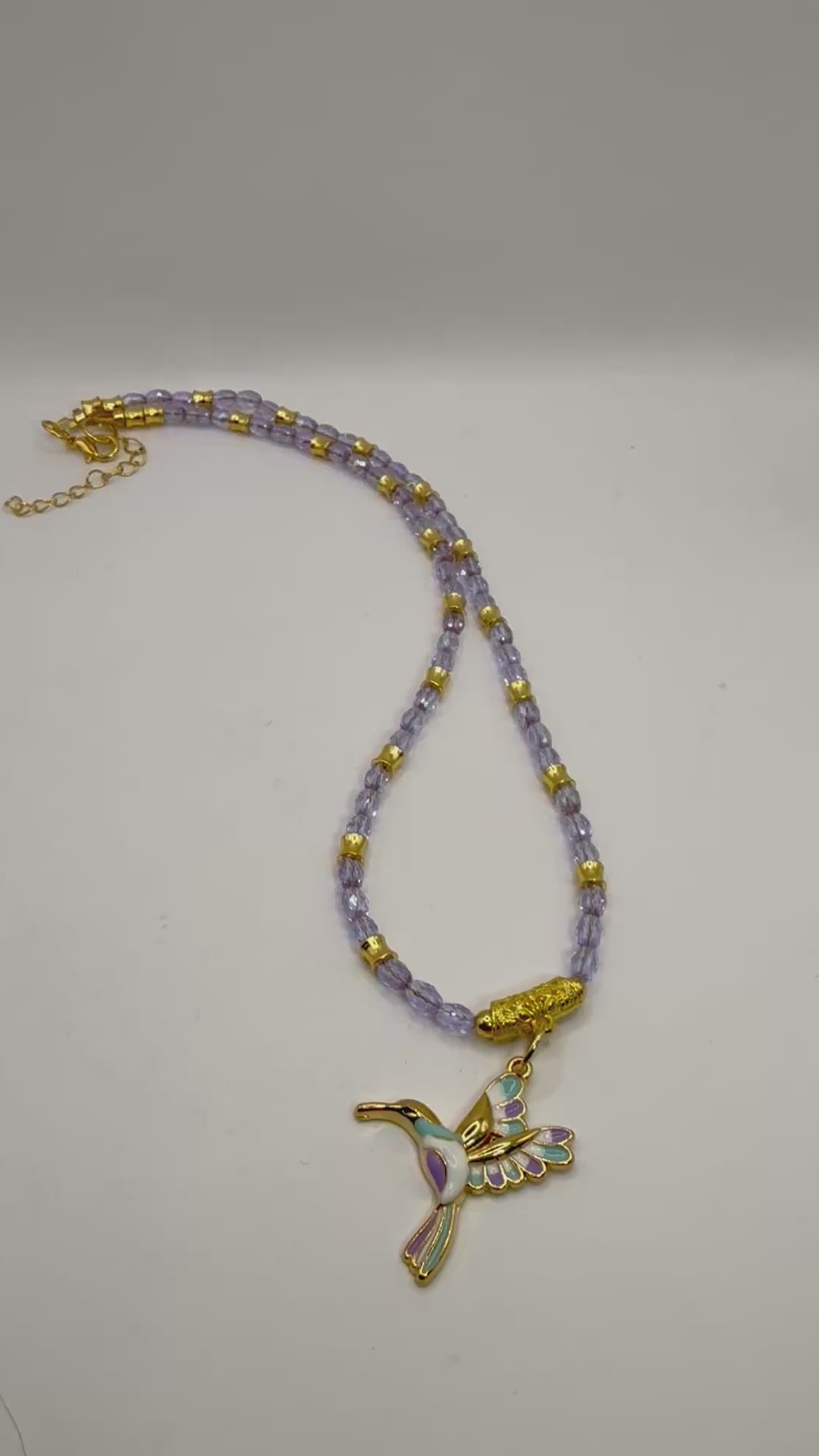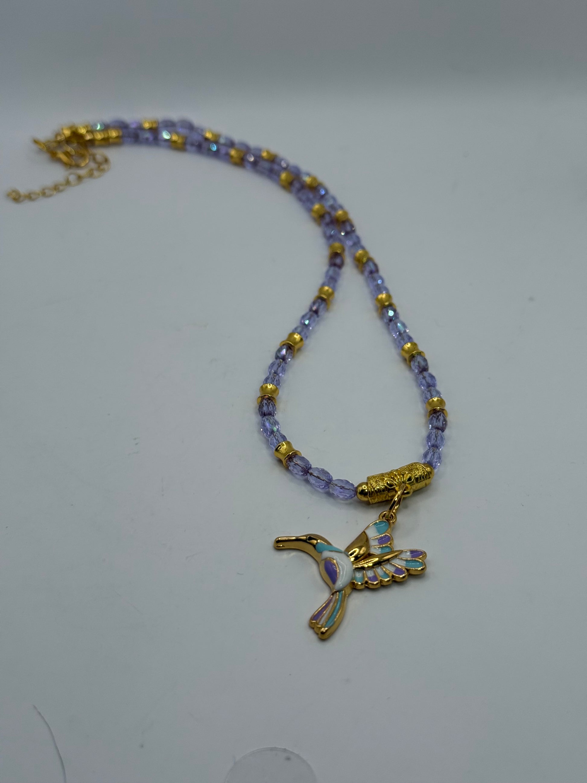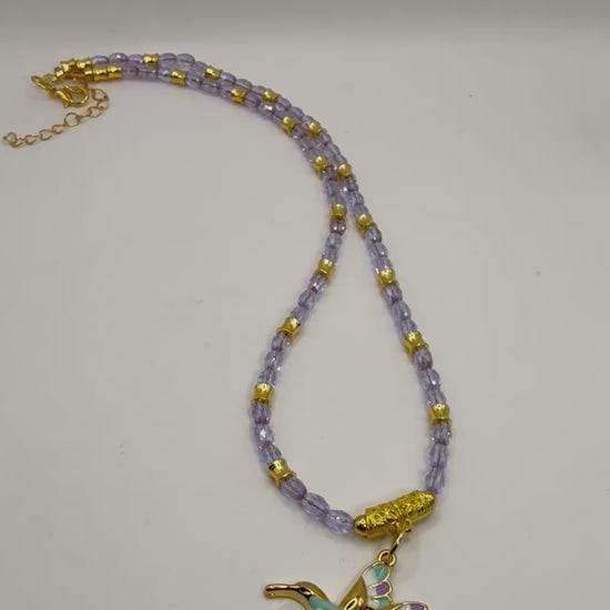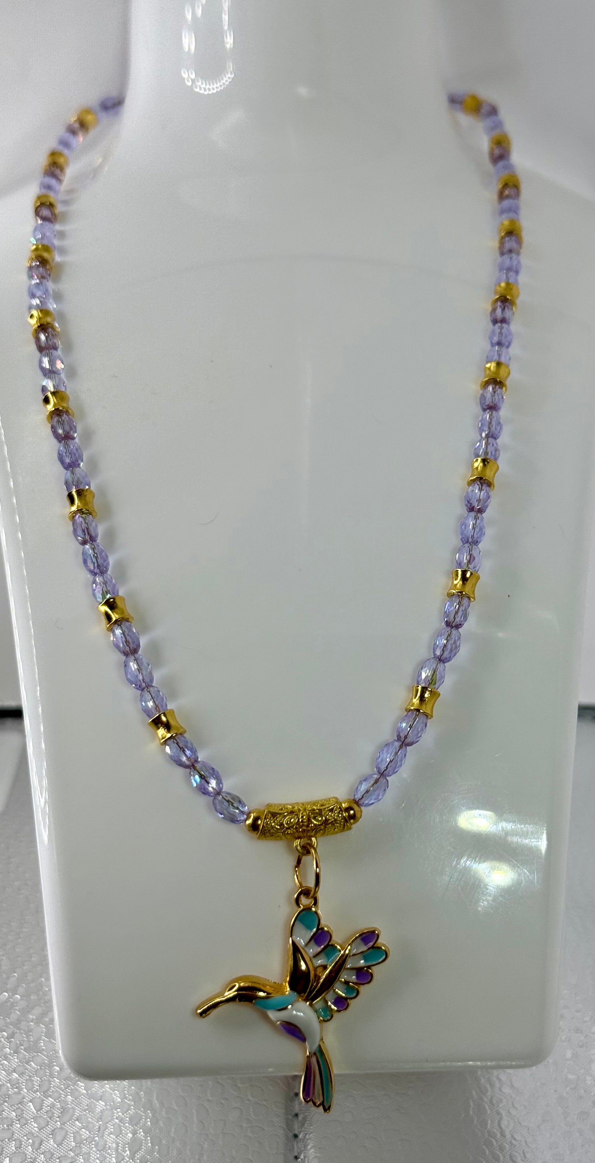 Bring a touch of elegance and whimsy to your look with this handcrafted purple faceted sparkly glass necklace featuring a vibrant hummingbird pendant. Each bead shimmers with light, paired with gold-tone accents for a luxurious finish. The necklace measures 18 inches in length, making it perfect for layering or wearing solo as a statement piece.