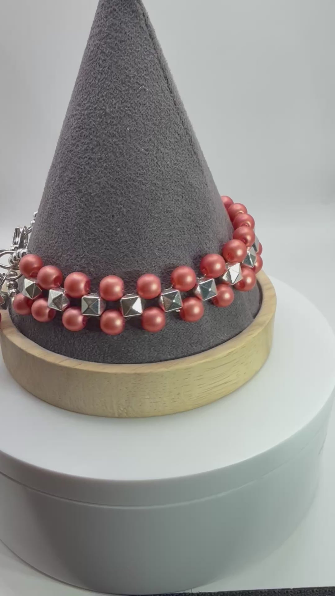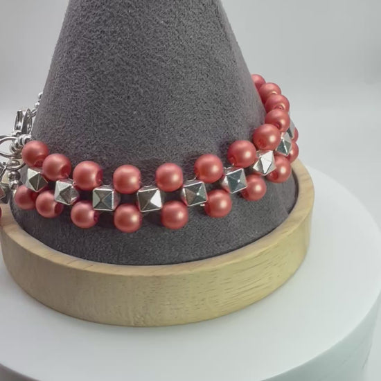 Show off your style with this handmade double strand clasp bracelet, designed with soft salmon-colored glass pearls and chic silver pyramid beads. The unique blend of warm pearls and edgy metallic accents creates a bracelet that is both modern and feminine — perfect for everyday wear or special occasions.