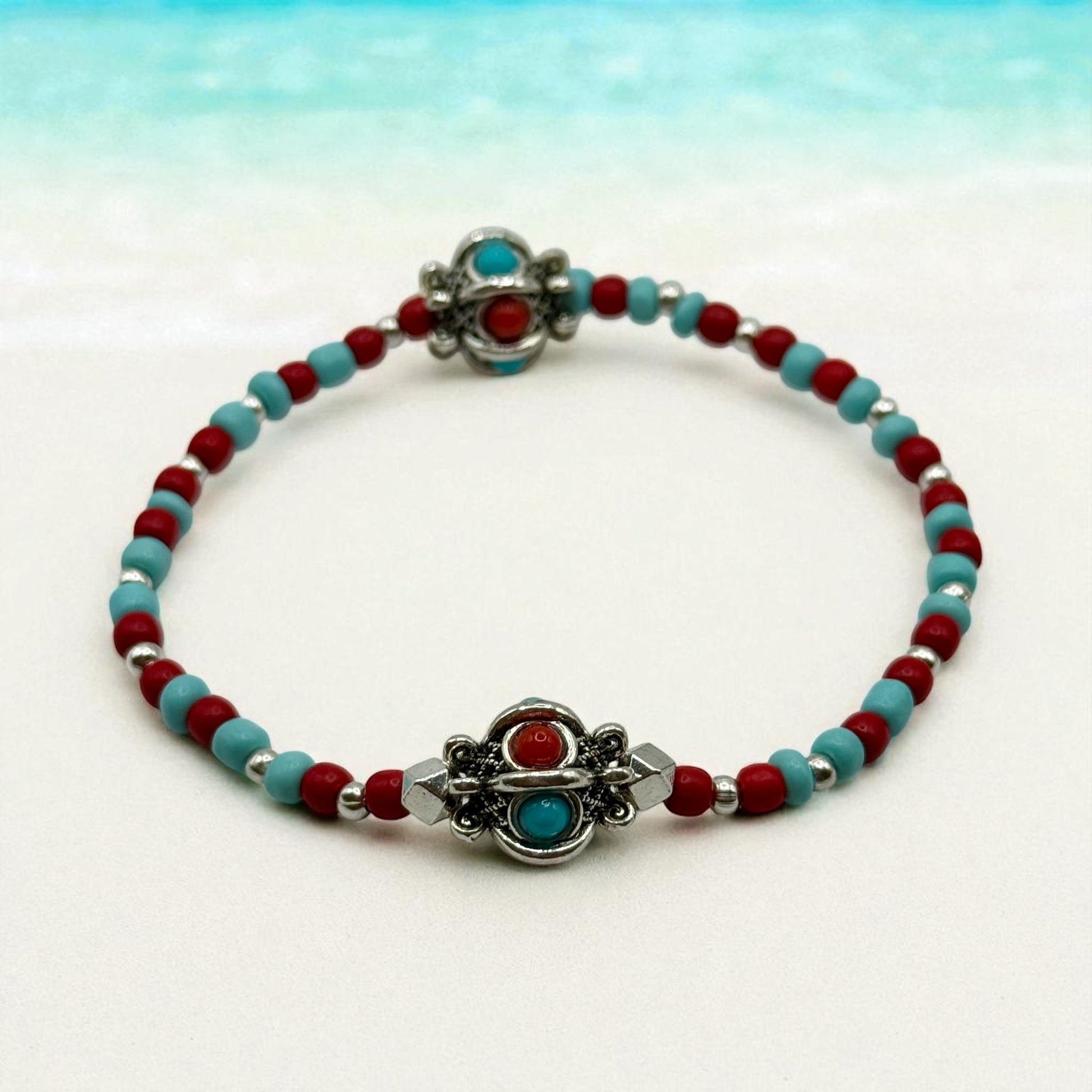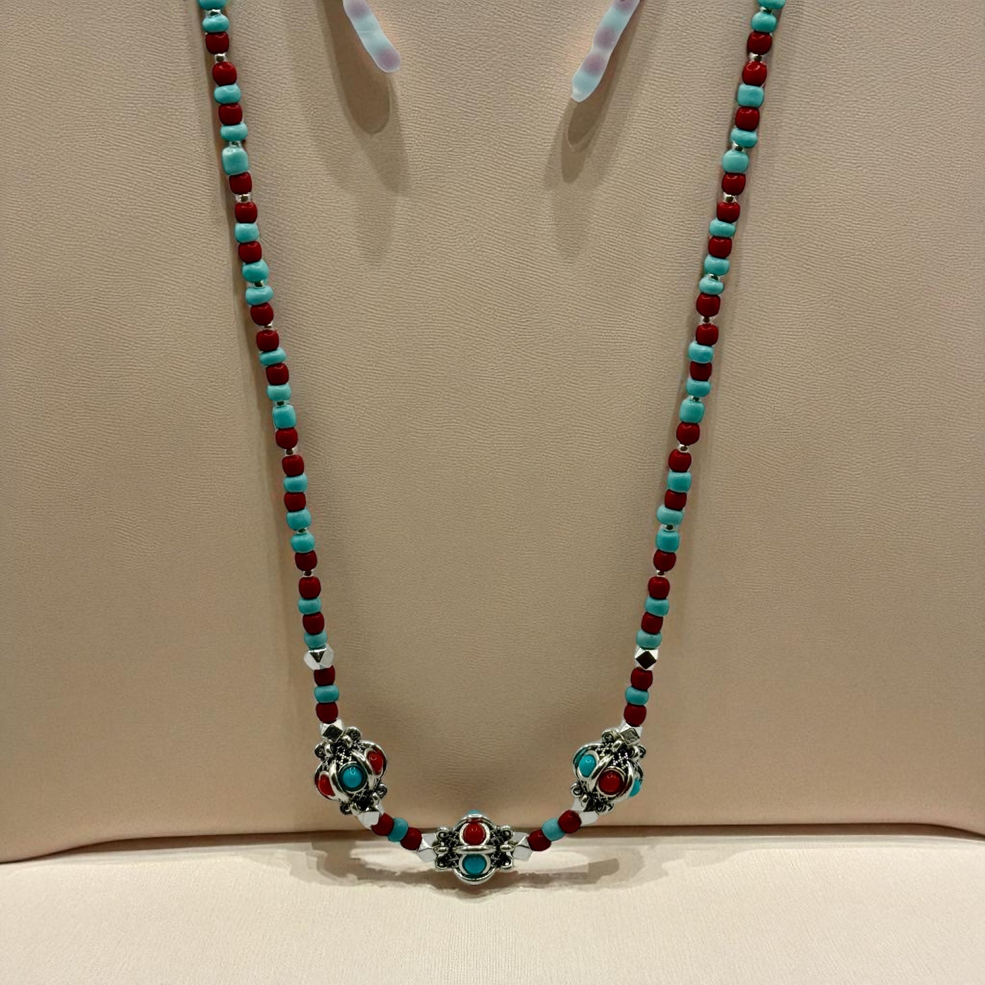- Materials: Enhanced turquoise & red glass beads, silver accents