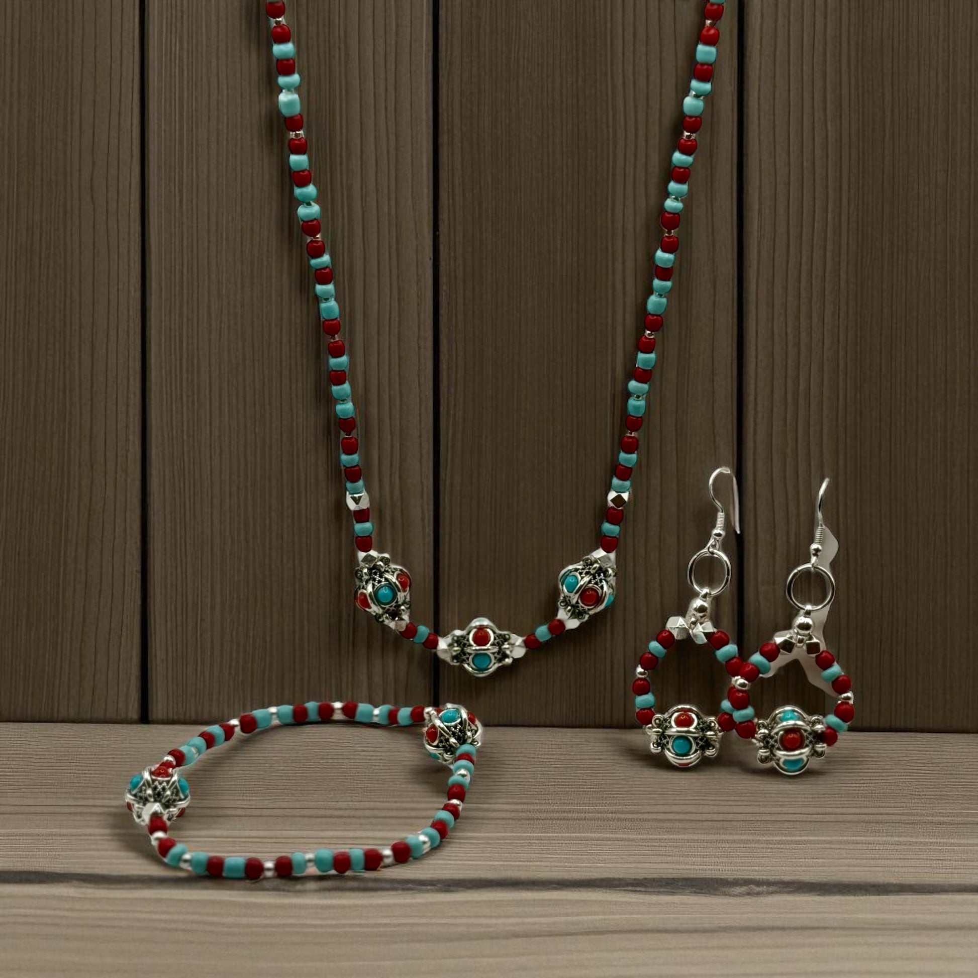 This vibrant handmade jewelry set from LuckyCharm Boutique TX blends enhanced turquoise blue and red beads with ornate silver focal details, capturing the heart of Southwestern artistry.