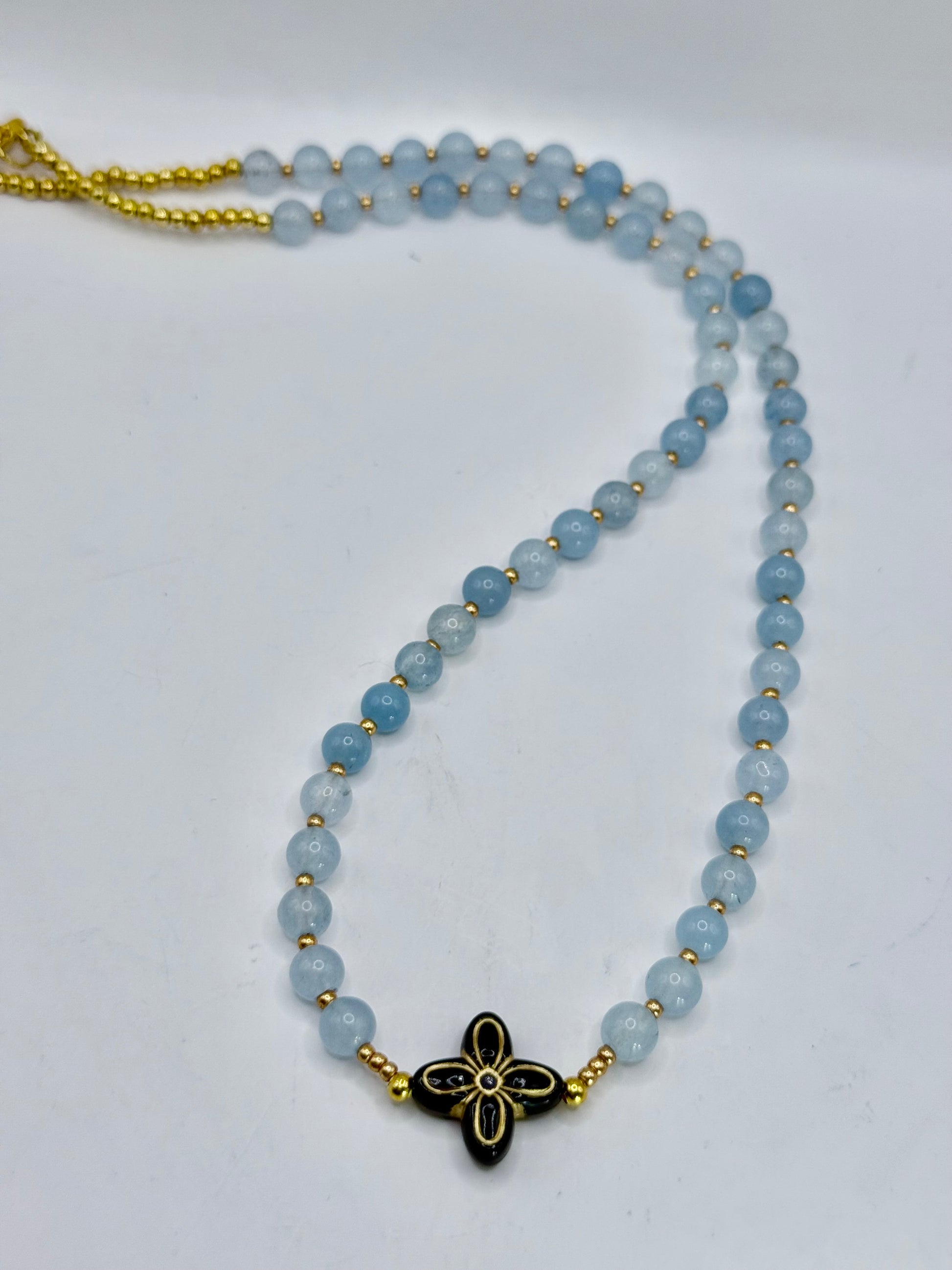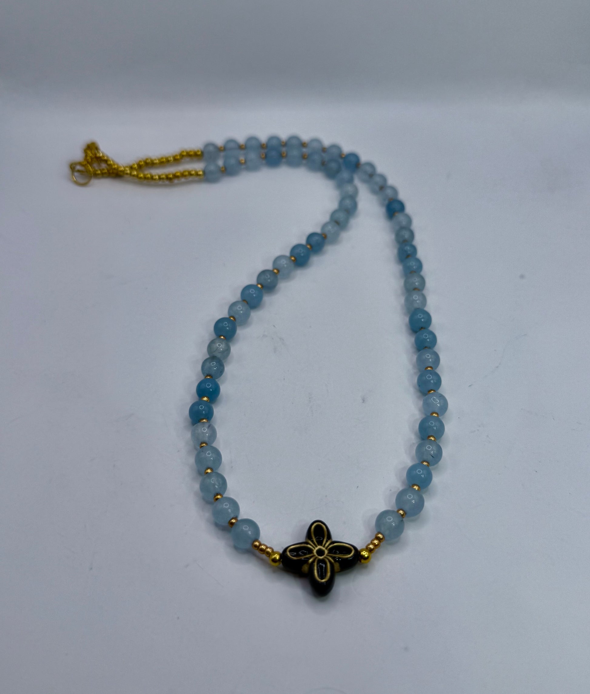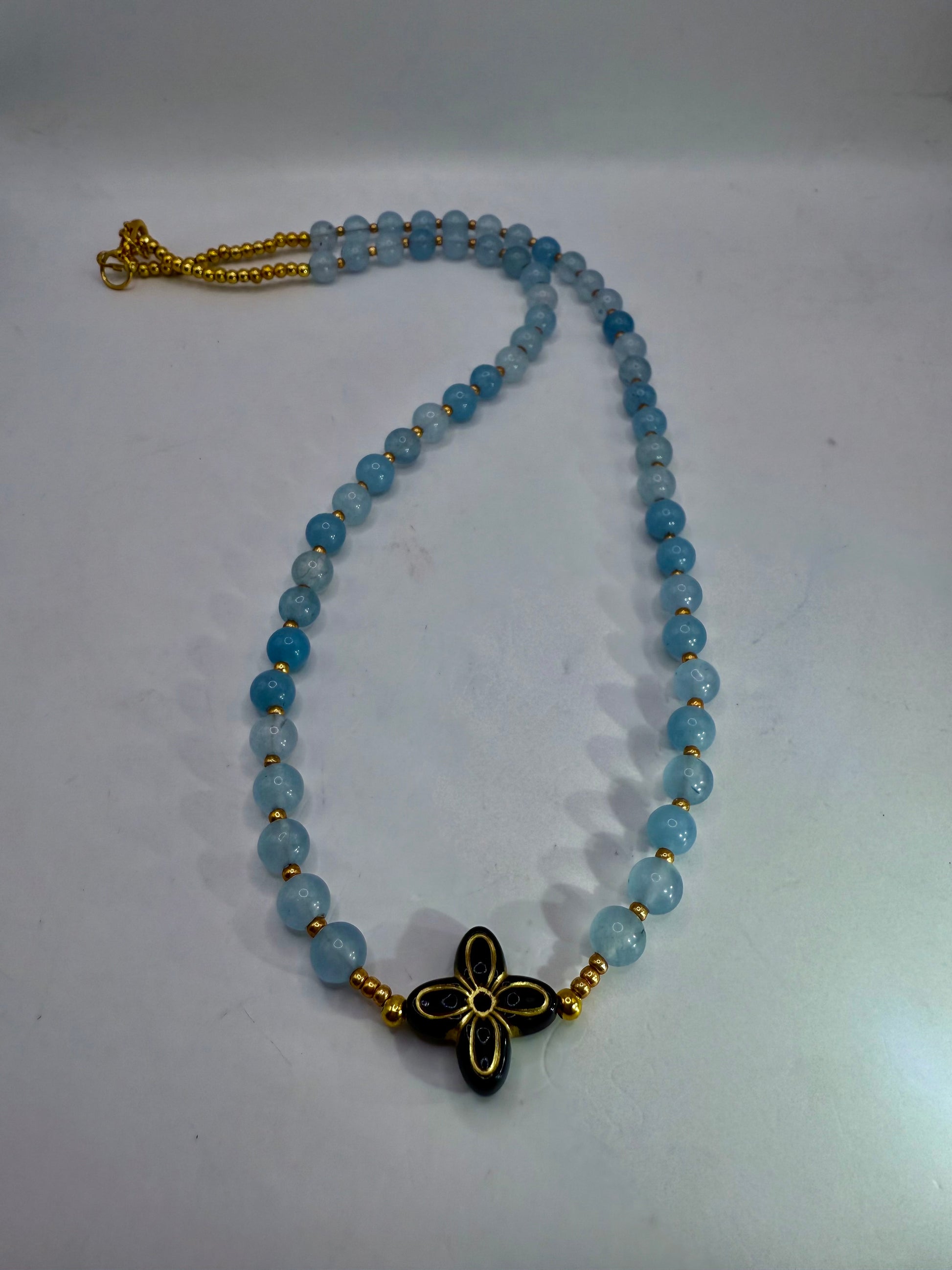 Add a touch of soft elegance to your look with this handcrafted 18” necklace featuring smooth soft-blue round beads, delicate gold micro-spacers, and a striking black-and-gold floral centerpiece. Beautifully balanced, lightweight, and versatile for everyday wear or special occasions.