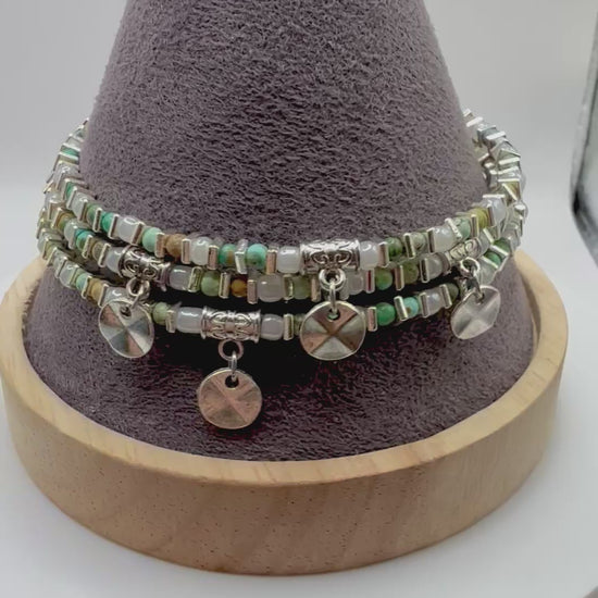 Glass Bead Wrap Bracelet with Silver Charms – Boho Layered Look, Handmade Jewelry Gift