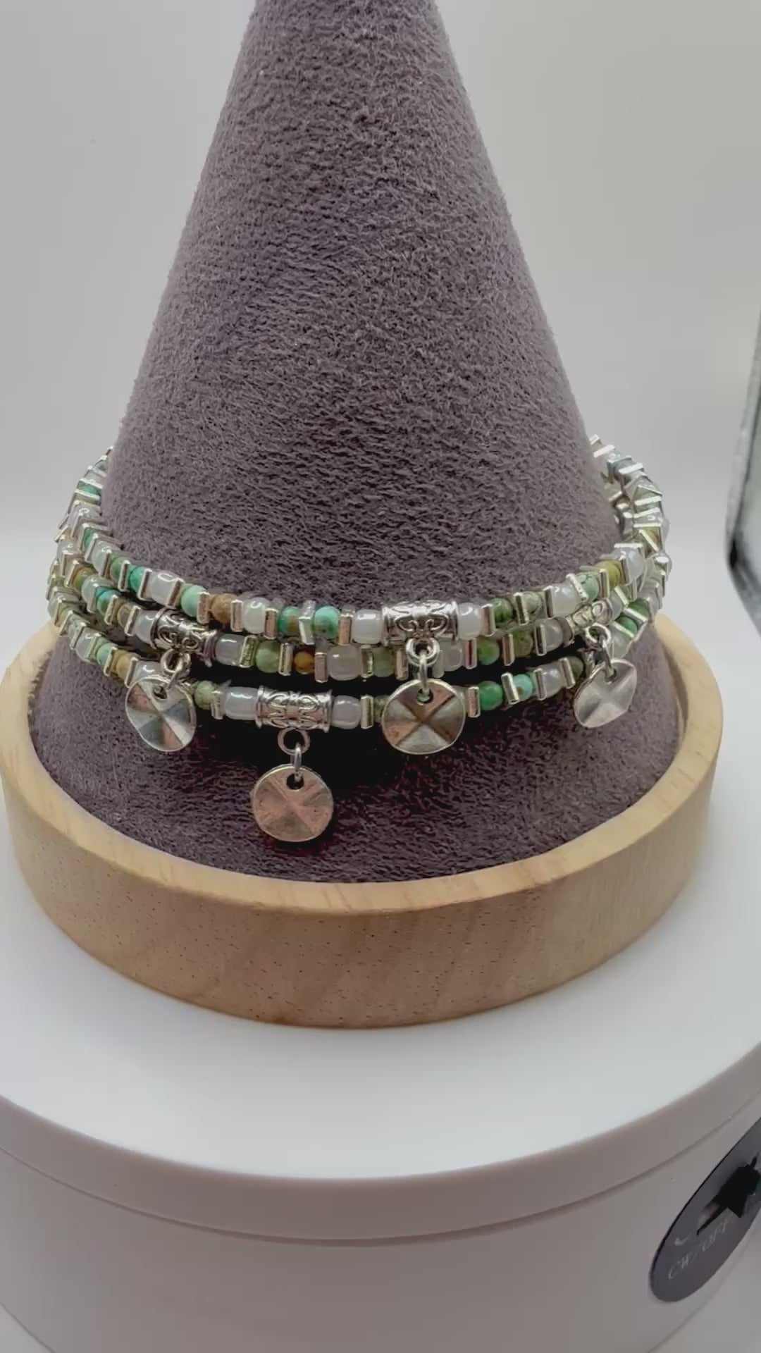Accented with silver-tone spacer beads and hammered coin charms, this boho-inspired piece is perfect for everyday wear, special occasions, or as a thoughtful handmade gift. Whether you pair it with denim or a flowy dress, this wrap bracelet adds a touch of artisan elegance.