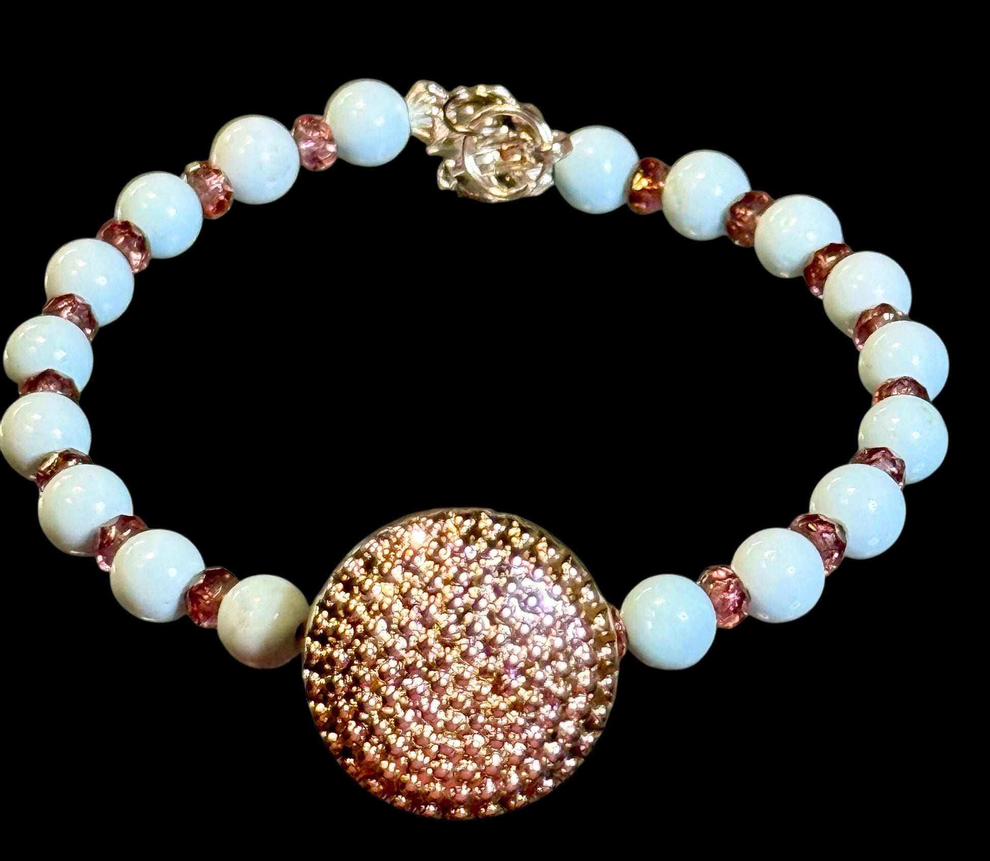 This Sky Blue and Silver Buckle Bracelet is the perfect addition to any outfit. The stunning blue glass beads are accentuated by a round silver buckle, creating a beautiful and versatile piece. Whether worn casually or for a night out, this bracelet adds a touch of elegance to any look.