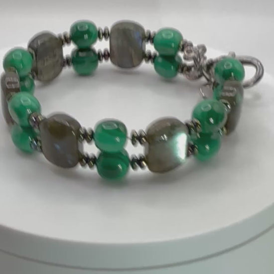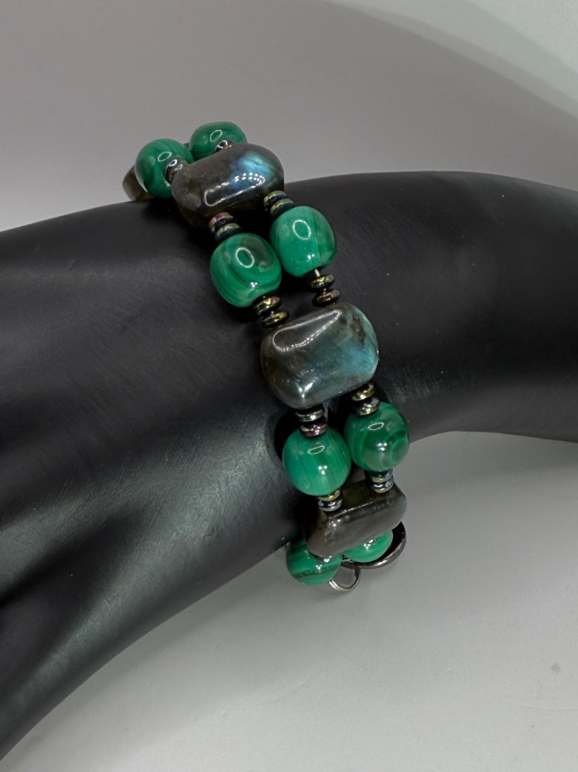 The pictures can’t capture the full beauty of this bracelet—it’s absolutely stunning in person! ✨ Handcrafted with glowing labradorite, striking malachite, and shimmering rainbow hematite, this double bangle clasp bracelet is a one-of-a-kind statement piece.The iridescent flashes of labradorite pair beautifully with the rich green patterns of malachite, while rainbow hematite spacers add extra shimmer and balance. Designed to fit wrists sized 7.5”–7.75”, the clasp closure ensures a comfortable and secure fit.💎 Stone Highlights:- Labradorite: Enhances intuition, protection, and transformation.