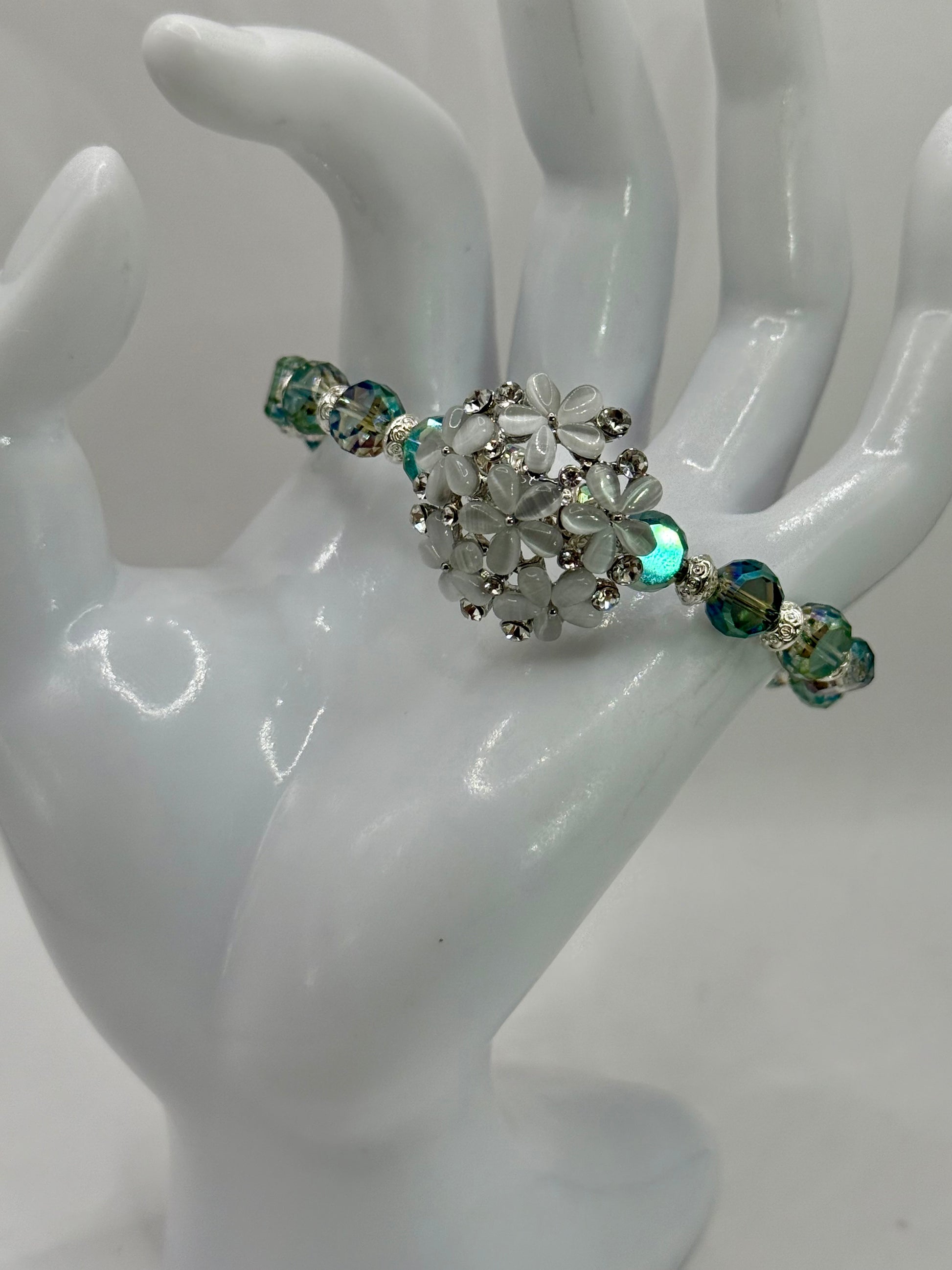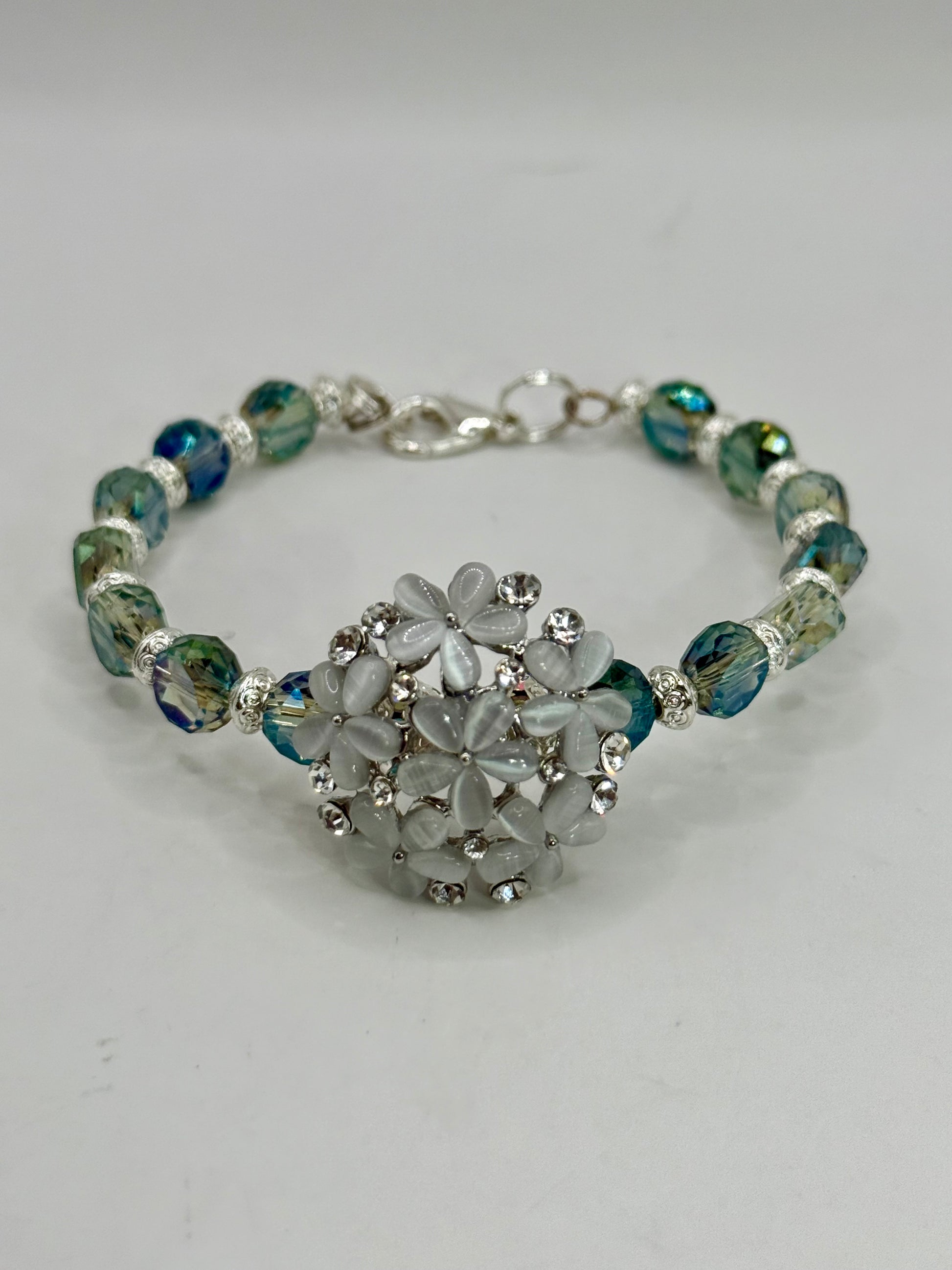 Elegant and eye-catching, this 7.5” floral bracelet features a stunning centerpiece of shimmering white flowers surrounded by sparkling rhinestones. Faceted beads in shades of green, aqua, and clear crystal complete the design, creating a sophisticated piece that’s perfect for any occasion.